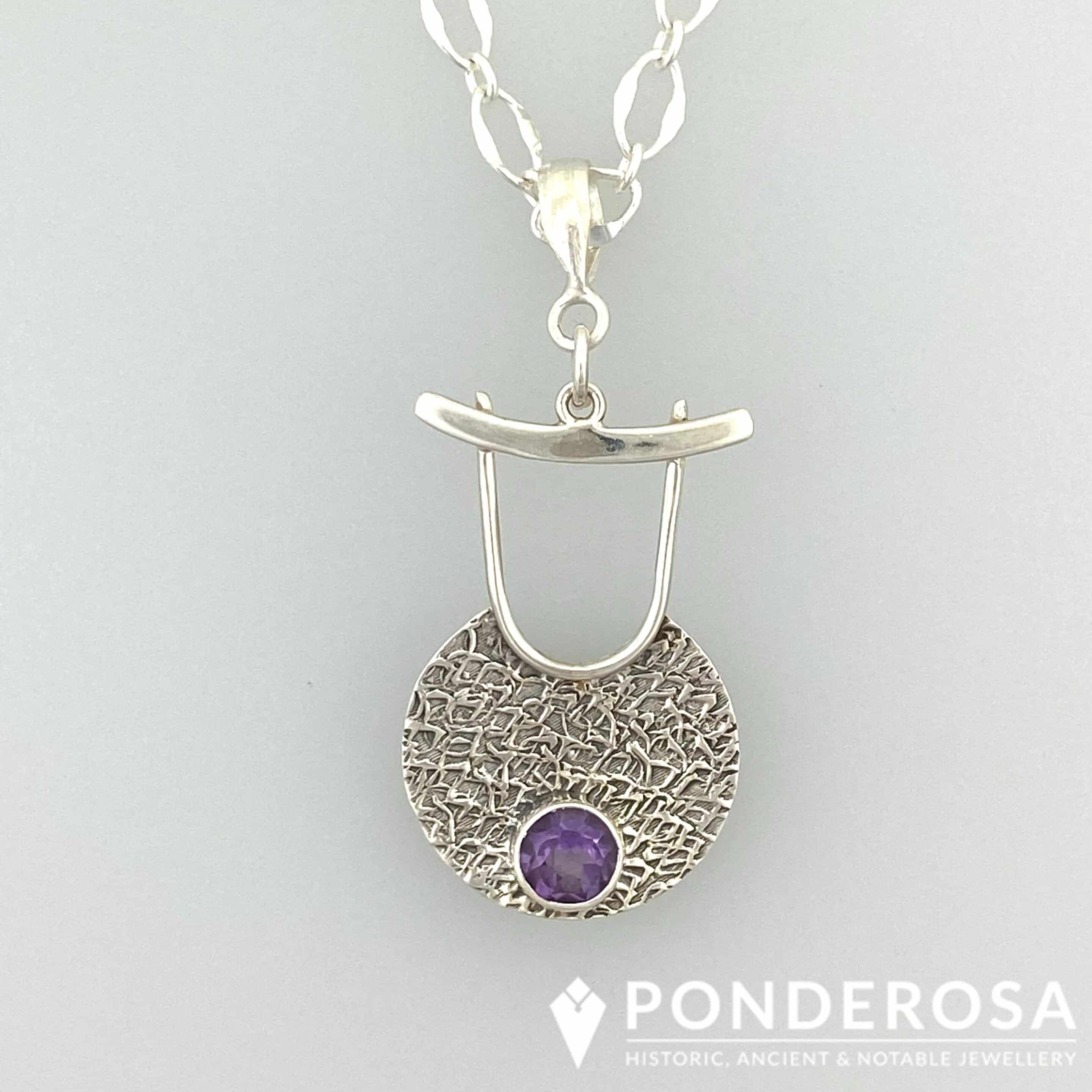 This shining faceted amethyst stone has been set in an intricate sterling silver design and paired with a silver plated chain.