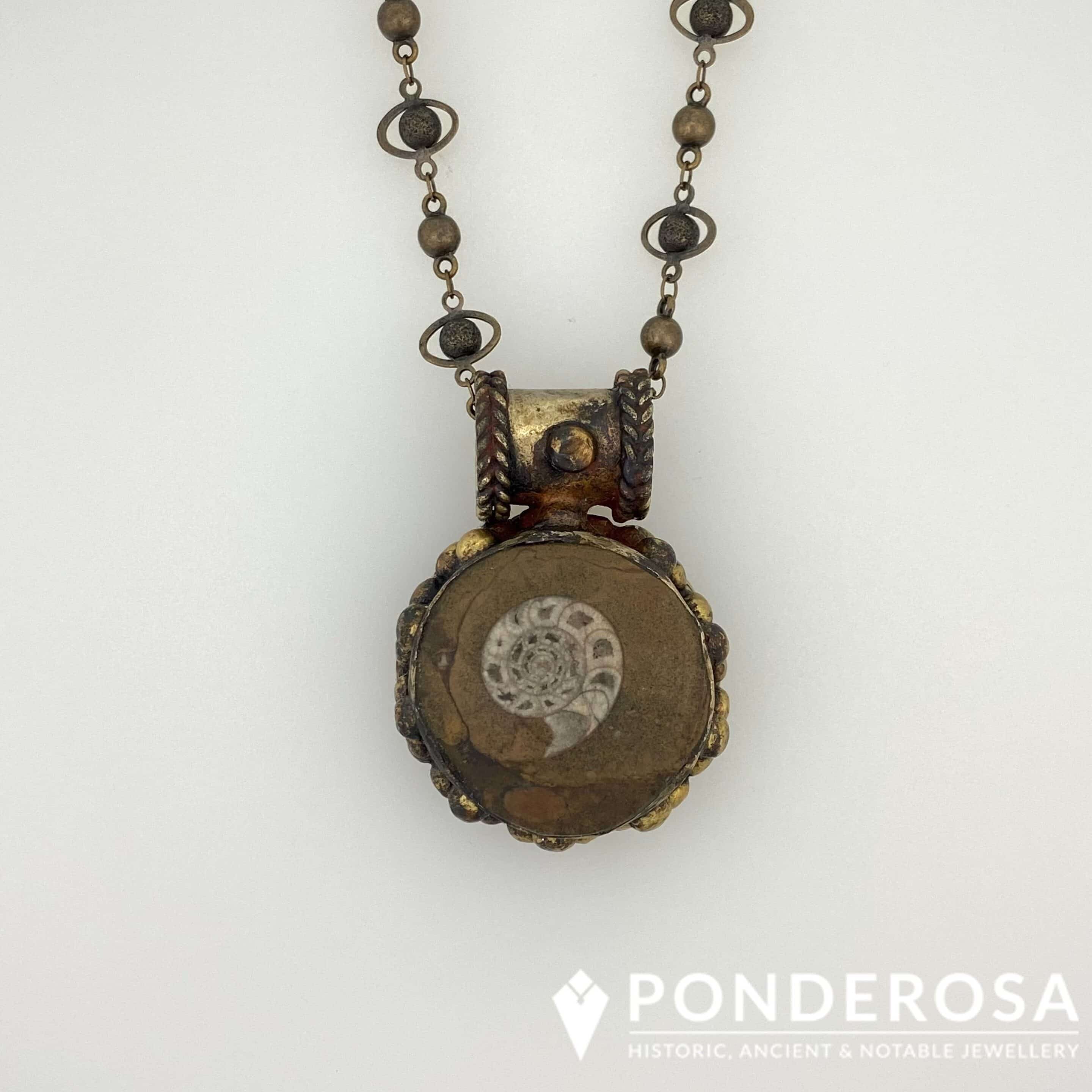 This unusual pendant with an inlaid ammonite fossil has been designed with a brass chain that is a great accent for the pendant.
