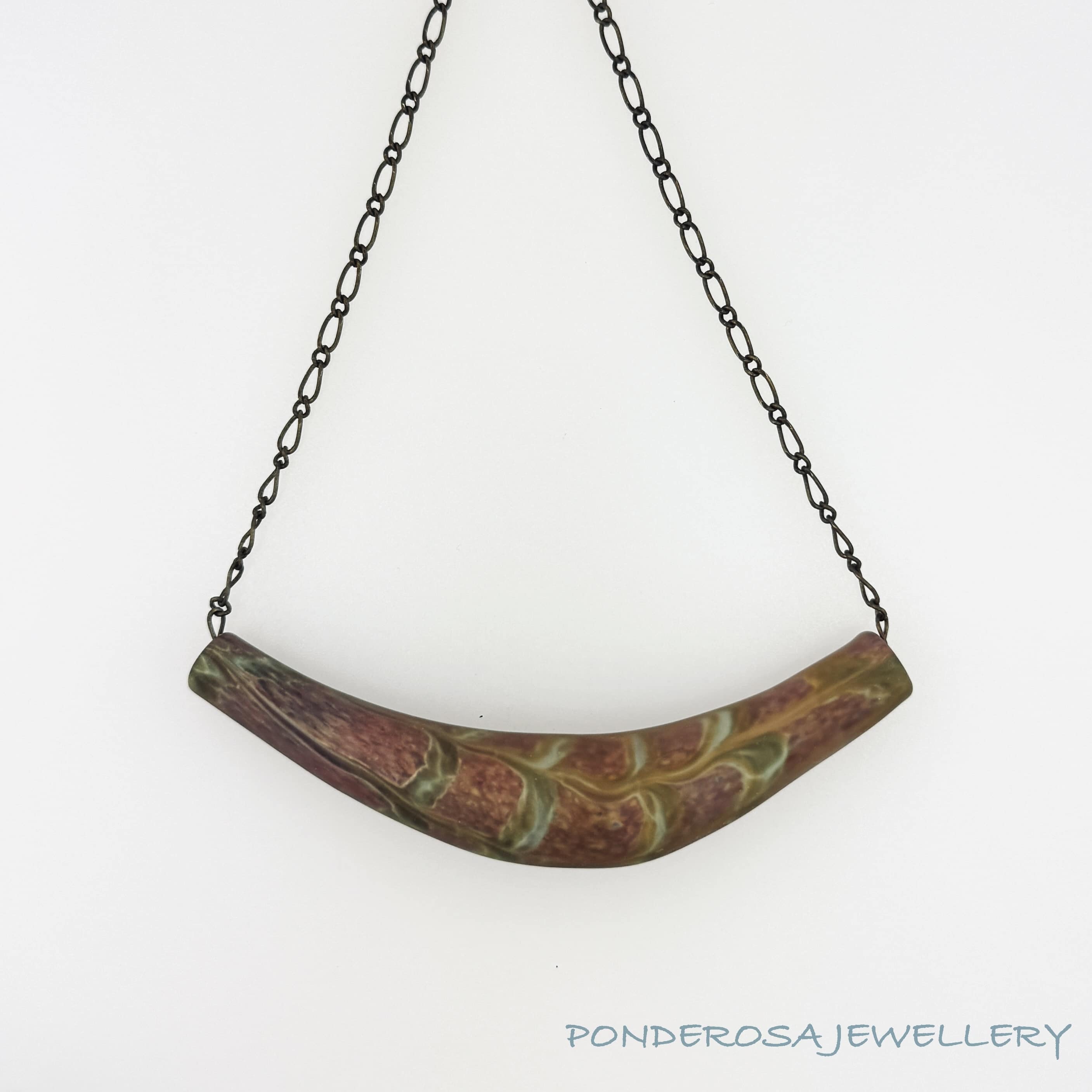 This pretty and charming “Art Glass” pendant has been paired perfectly with a brass chain. Necklace length: 20 ” Necklace material: brass Pendant size: 3/4 ” tall x 3 1/2 ” wide