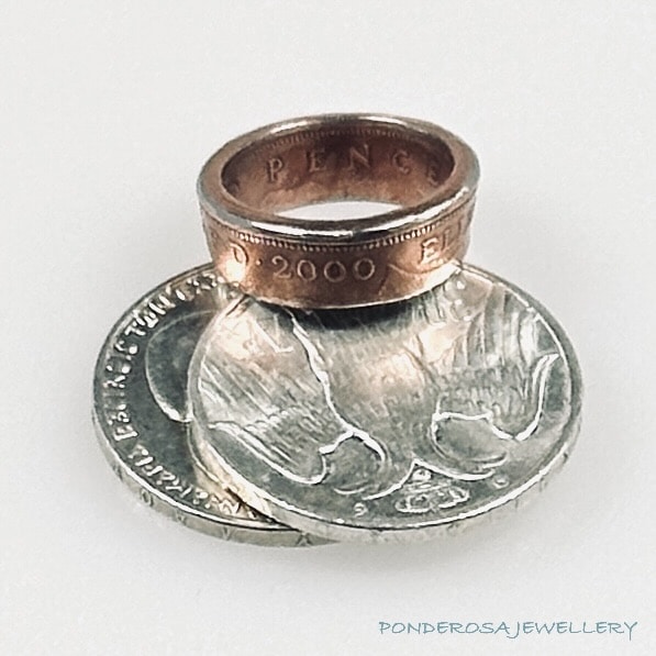 This Copper/Steel coin has been turned into a size 7 1/2 ring. This coin has a copper content of 80 percent.