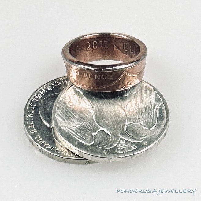 This Copper/Steel coin has been turned into a size 7 3/4 ring. This coin has a copper content of 80 percent.