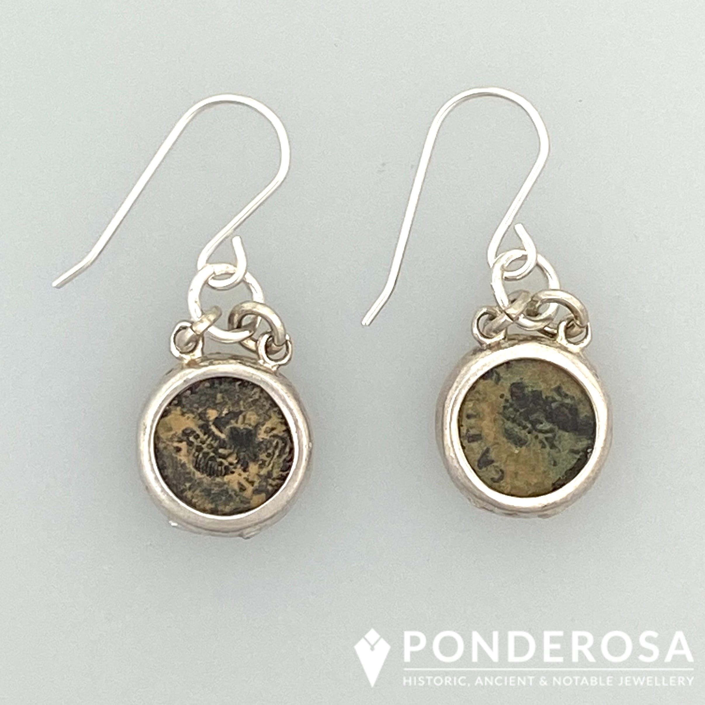 These “one of a kind” bronze coins are 2000 years old and have been set in sterling silver. These earrings are a magnificent piece of wearable historic jewellery, sure to treasured for many years to come. Earring material: bronze & sterling silver Earring size: 1/2 ” round Earring wire: sterling silver