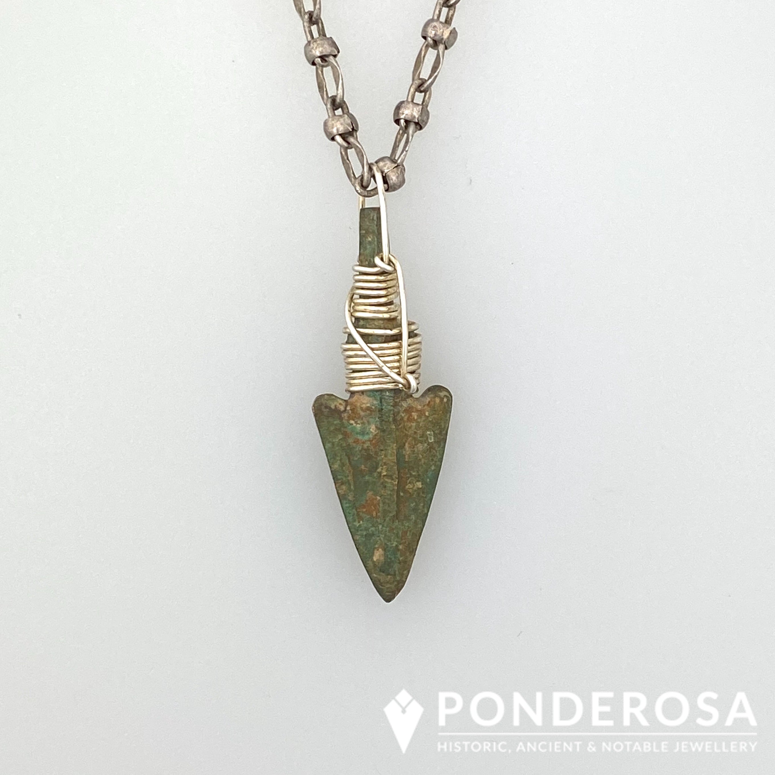 This ancient bronze arrowhead has been wrapped with sterling silver wire and turned into a wearable piece of history!