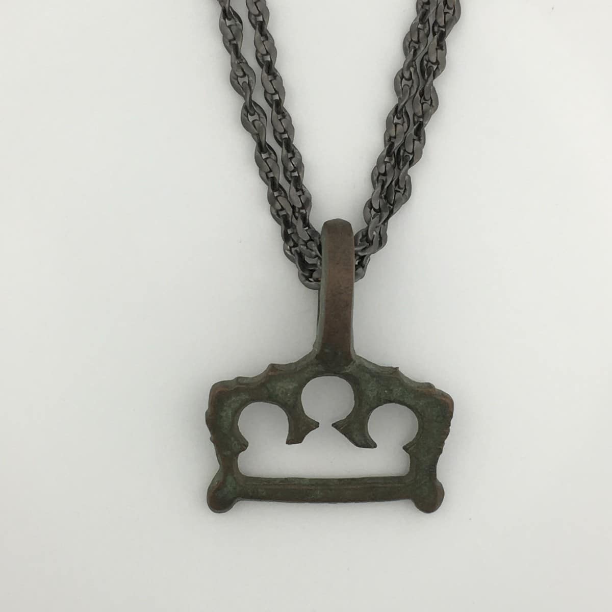 This very unique pendant is a 2000 year old bronze artifact is probably a buckle from horse tackle. The necklace has been designed with 21 inches of matte black chain which is lead and nickel free.