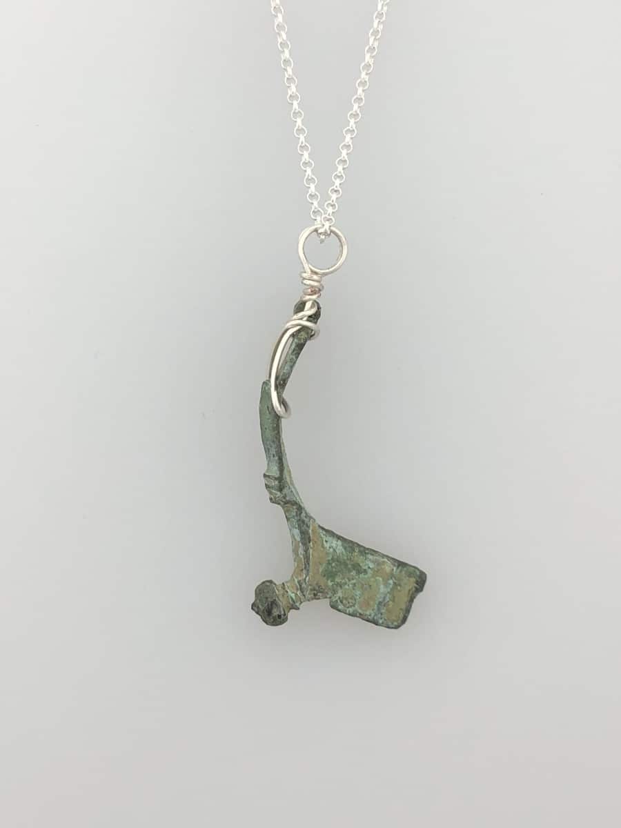 This unique 2000 year old bronze artifact pendant has been turned into a wearable piece of history. It is a one of a kind, magnificent piece, sure to treasured for many years to come. It has been finished with a 18 inch sterling chain.