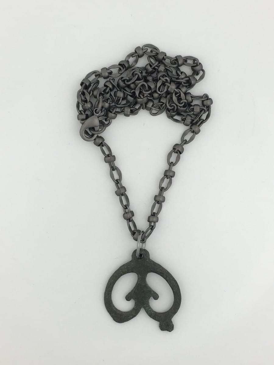 This very unique pendant is a 2000 year old bronze artifact is probably a buckle from horse tackle. The necklace has been designed with 18 inches of pewter chain which is lead and nickel free.