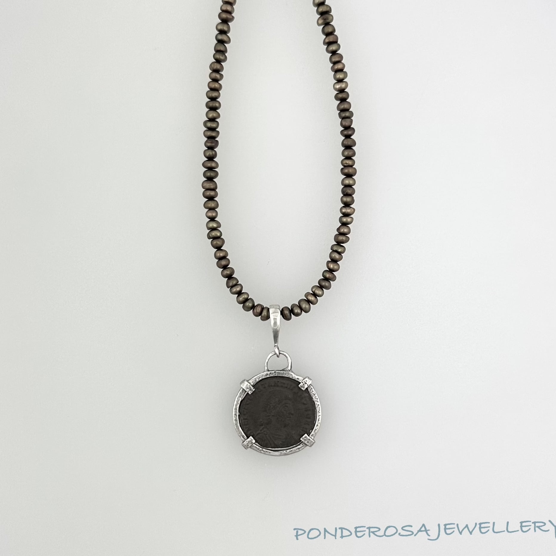 This 2000 year old bronze coin is set in sterling silver, then finished with freshwater pearls, allowing this artifact to be admired. The necklace comes with a certification card for the coin giving a description of the Empire it is from.