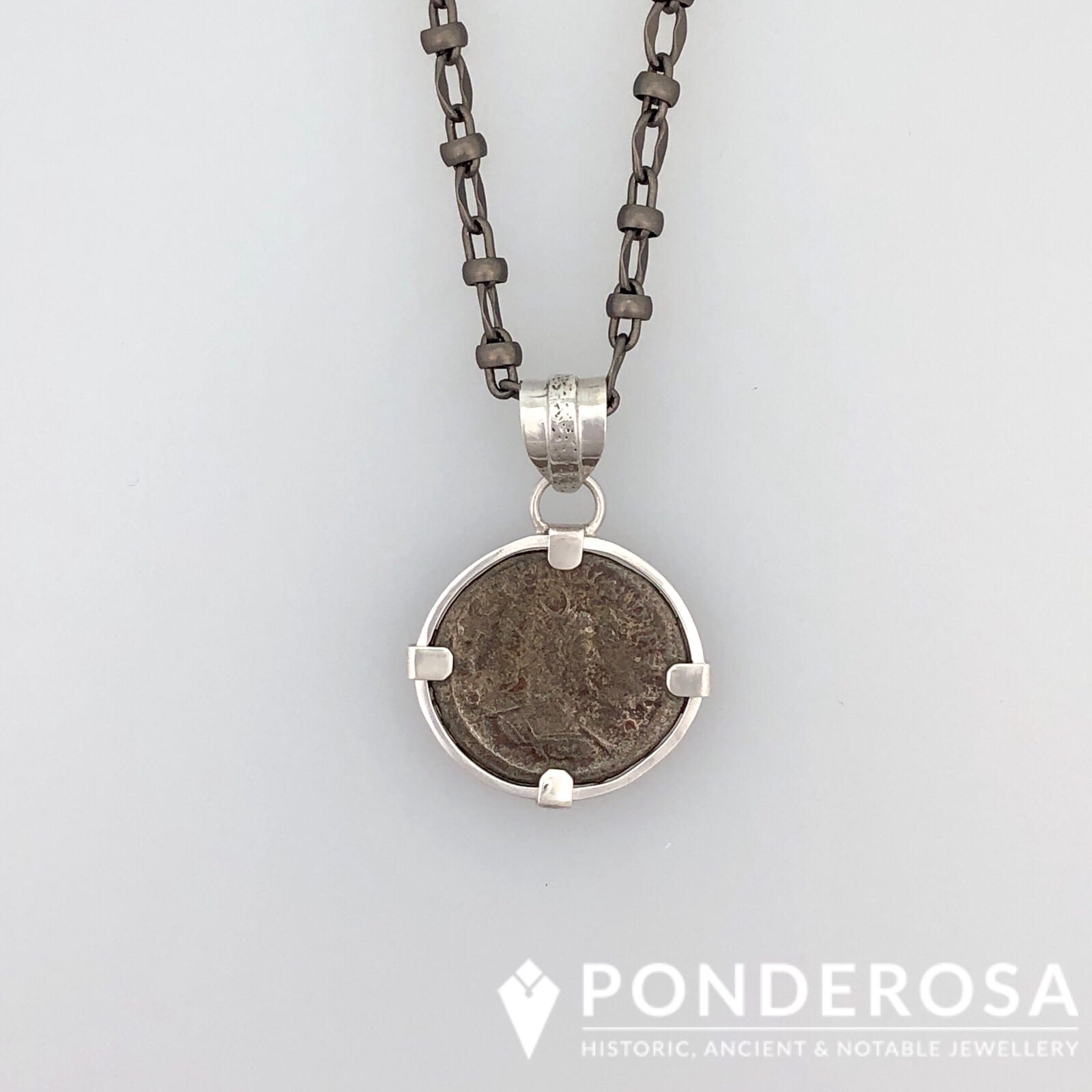 This 2000 year old bronze coin has been set in sterling silver and finished with a 19 inch pewter chain which allows this artifact to be admired. The necklace comes with a certification card for the coin giving a description of the Empire it is from.