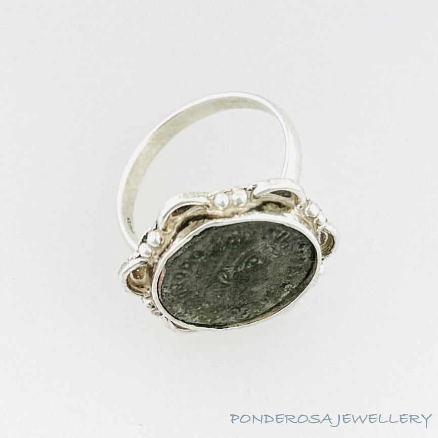 From the time of Augustus to the fall of the Western Empire. Rome’s dominion covered all of the following: England and Wales, most of Europe; coastal northern Africa, together with the adjacent province of Egypt; the Balkans, the Black Sea, and Asia Minor, and also much of the MIddle East. The coinage was minted throughout these regions in many different metals including bronze, silver and gold. This coin, which was been set in sterling silver, is unconditionally guaranteed to be authentic.