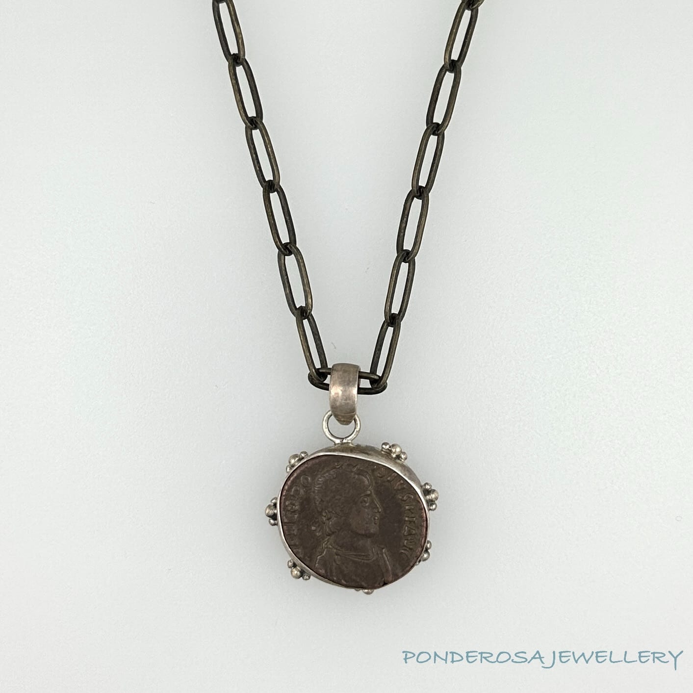 This 2000 year old bronze coin is set in sterling silver, then finished with a 18 inch brass chain, allowing this artifact The necklace comes with a certification card for the coin giving a description of the Empire it is from.