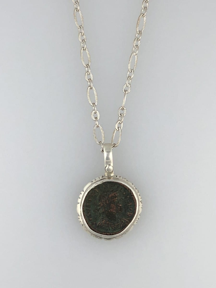 This 2000 year old bronze coin is set in sterling silver, then finished with a 16 inch sterling silver chain allowing this artifact to be admired. The necklace comes with a certification card for the coin giving a description of the Empire it is from.