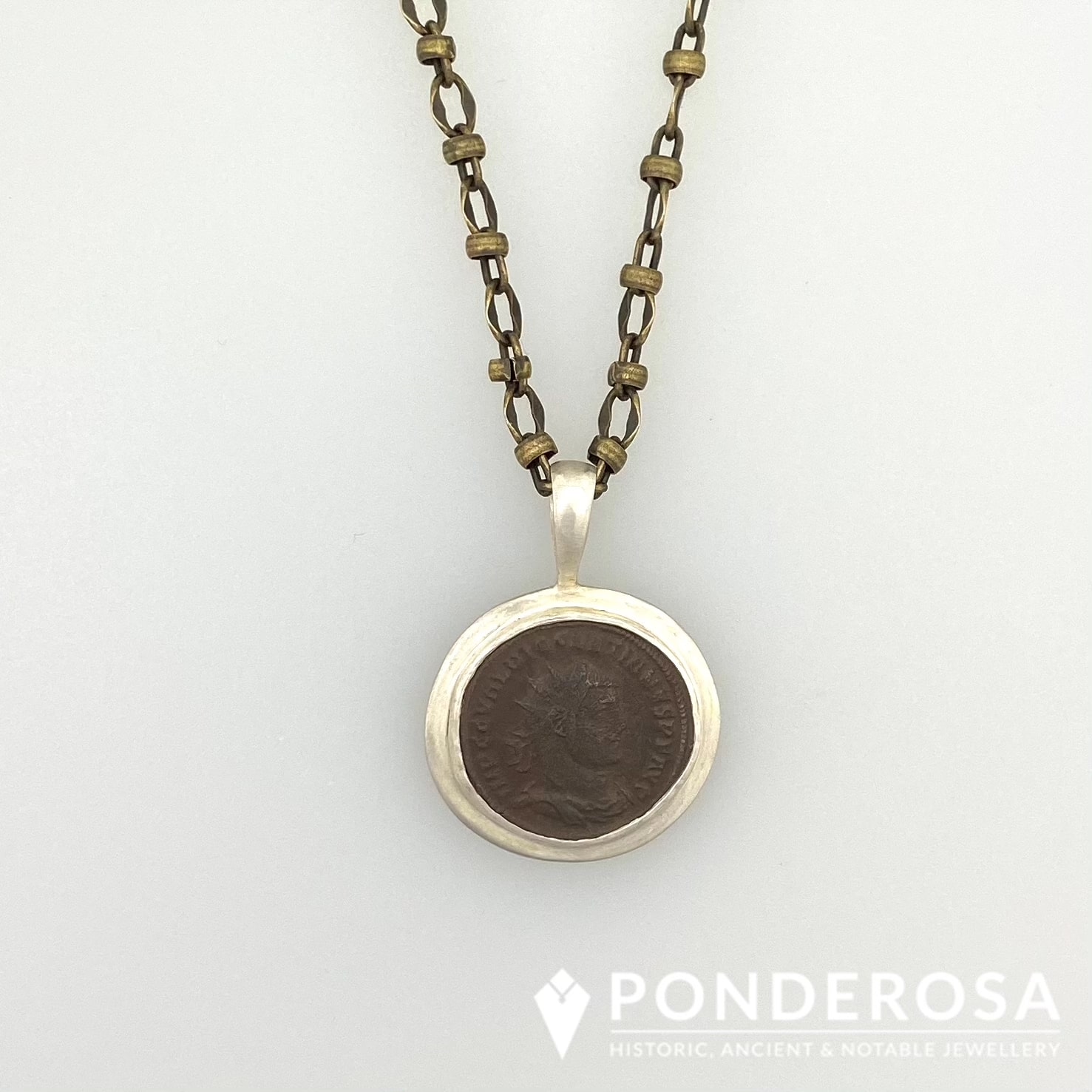 This 2000 year old bronze pendant has been set in sterling silver and then finished with a 18 inch brass chain, which allows this artifact to be admired.