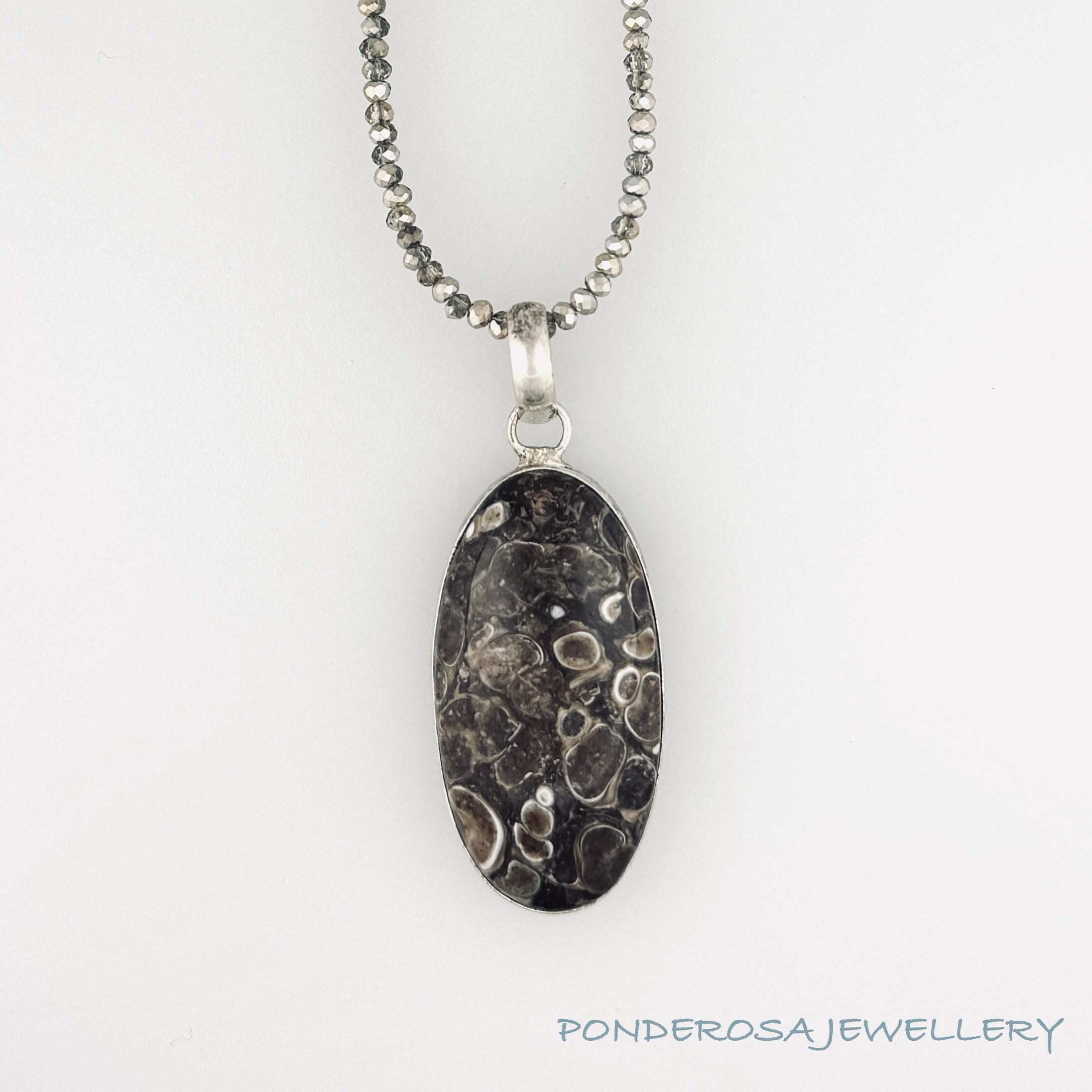 This striking jasper stone pendant has been set in sterling silver and designed with faceted glass beads.