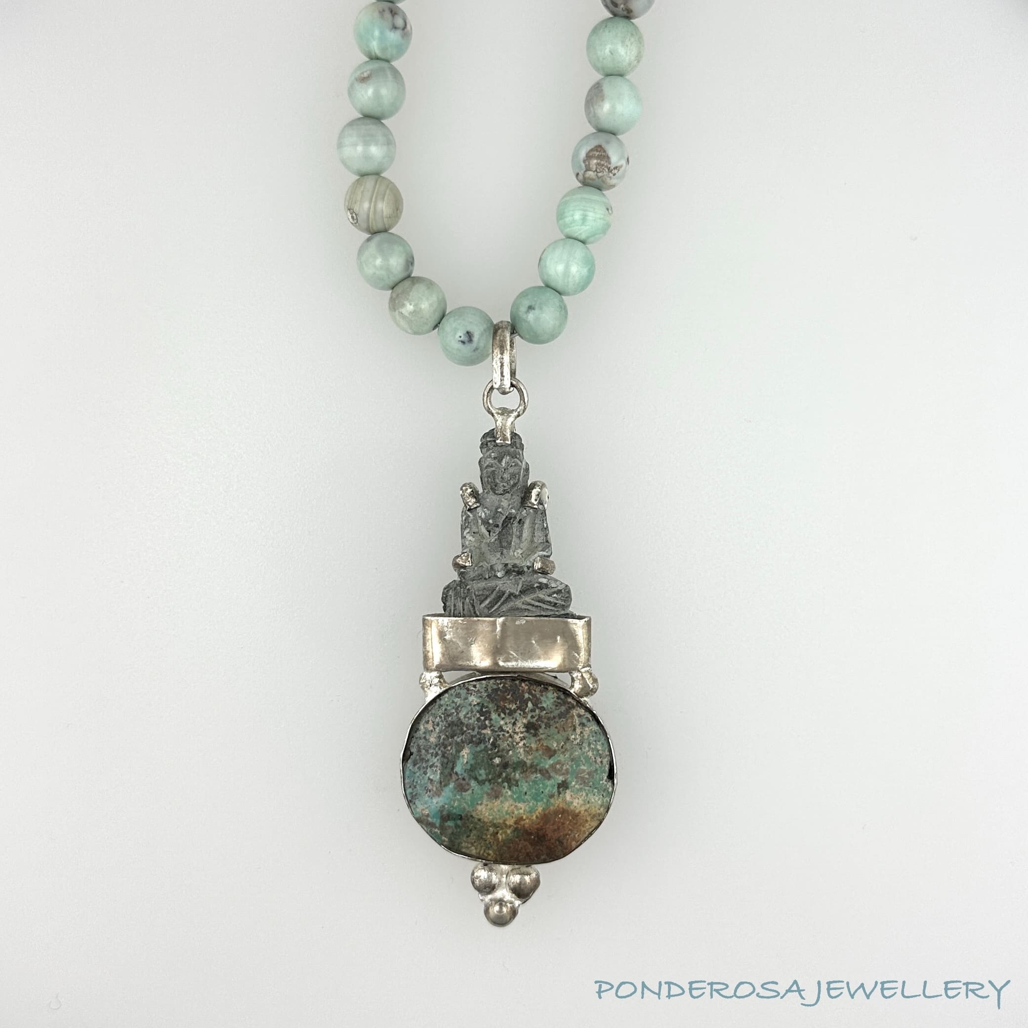 This very cool metal Buddha has been designed with a large turquoise stone and light blue round stones which compliment the pendants natural finish.