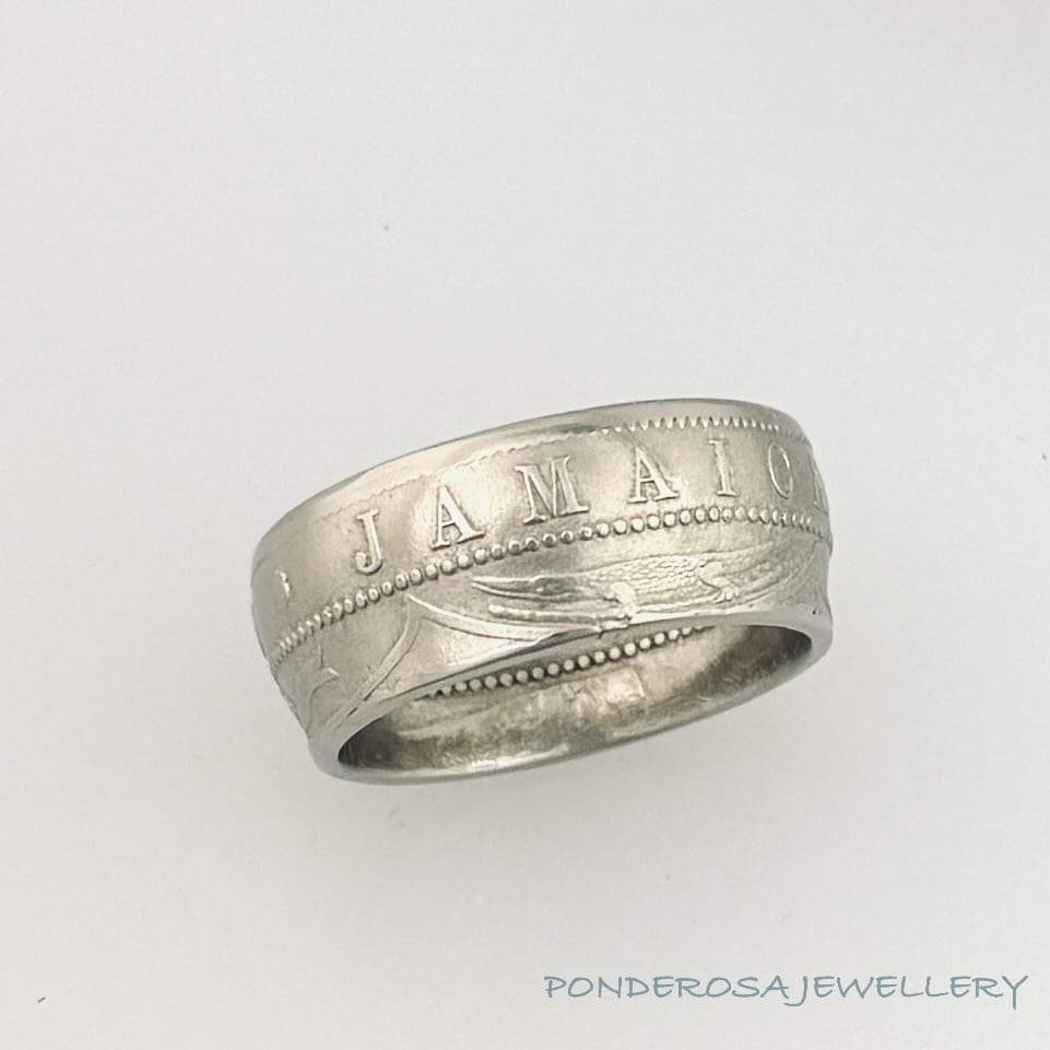 This 1918 “One Penny” from Jamaica has been turned into a size 9 ring. This coin ring has a copper content of 80 %. Enjoy wearing this very unusual piece of History.
