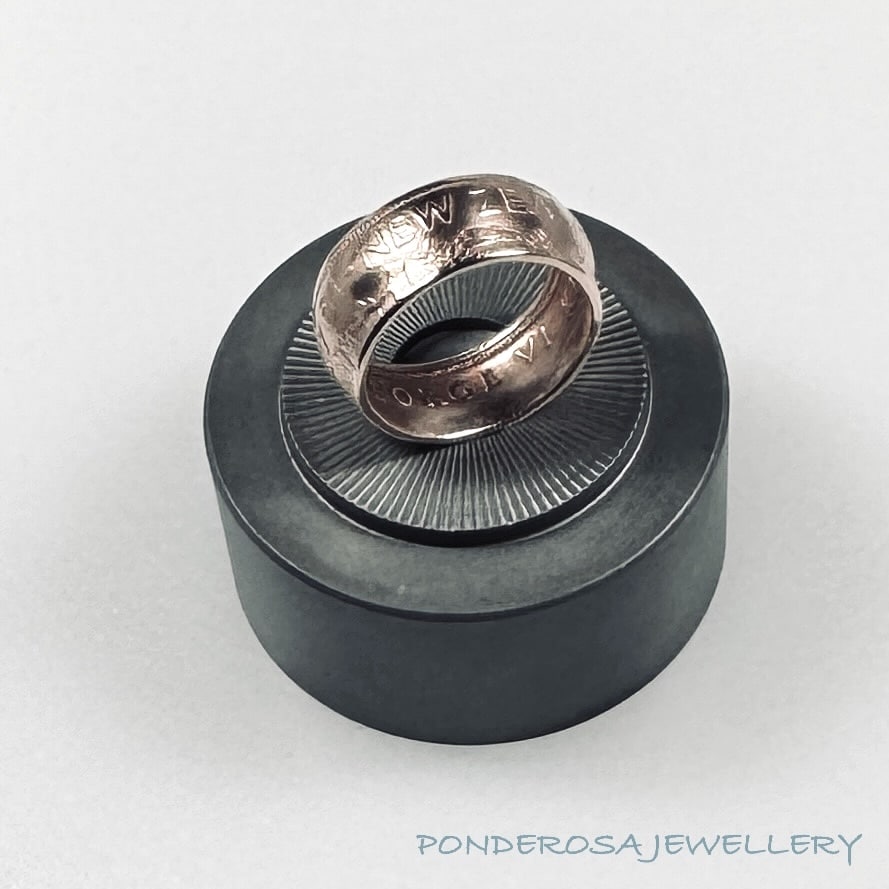 This 1947 “One Penny” from New Zealand has been turned into a size 8 1/2 ring. This coin ring has a copper content of 90 %. Enjoy wearing this very unusual piece of History.