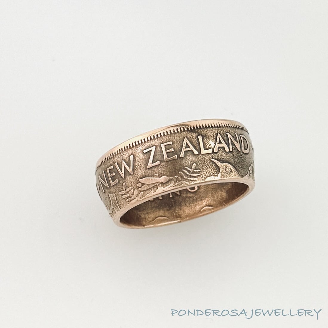 This 1951 “One Penny” from New Zealand has been turned into a size 9 ring. This coin ring has a copper content of 90 %. Enjoy wearing this very unusual piece of History.