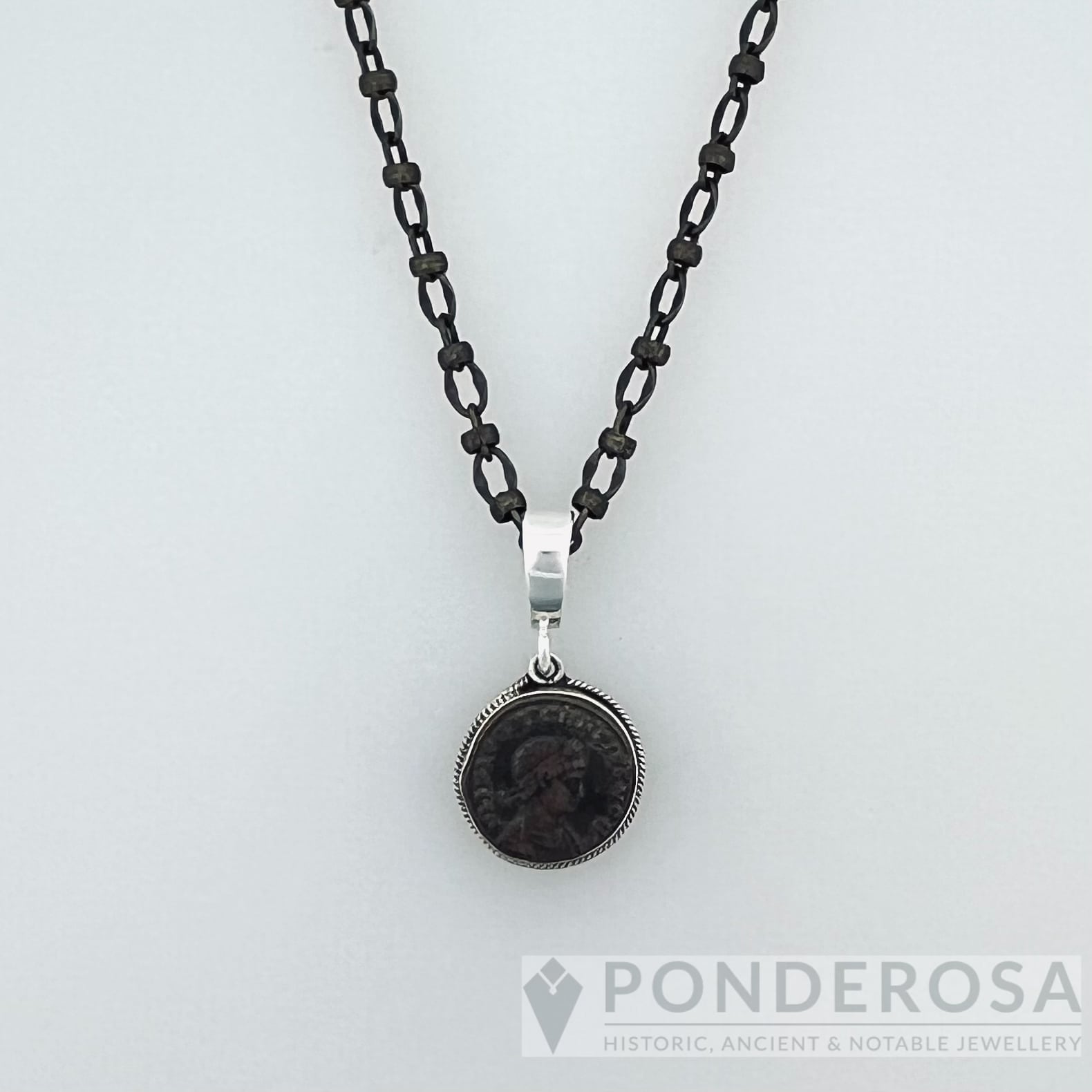 This 2000 year old bronze coin is set in sterling silver, then finished with a 19 inch pewter chain allowing this artifact to be admired. The necklace comes with a certification card for the coin giving a description of the Empire it is from.