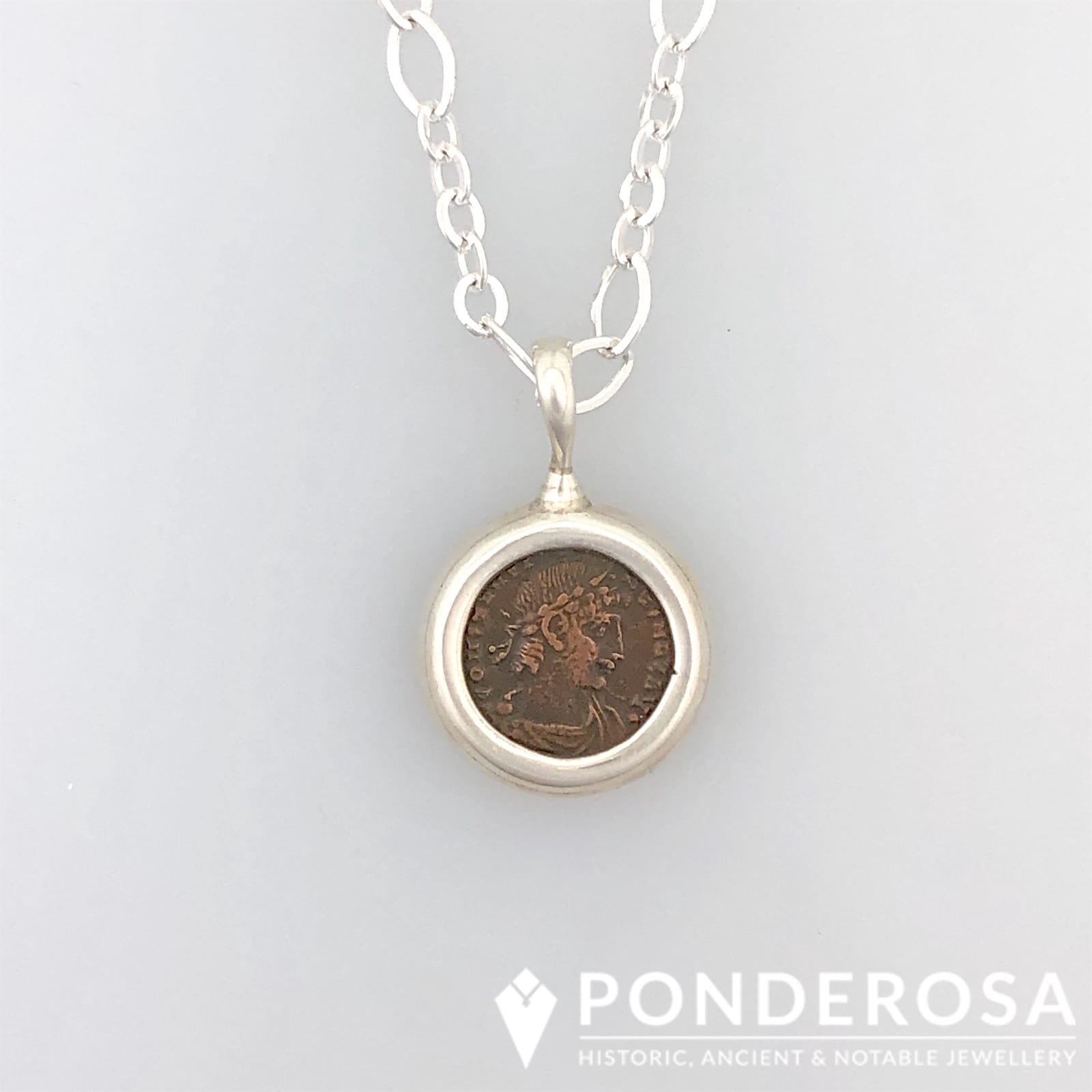 This 2000 year old bronze coin is set in sterling silver, then finished with a 19 sterling silver chain allowing this artifact to be admired. The necklace comes with a certification card for the coin giving a description of the Empire it is from.