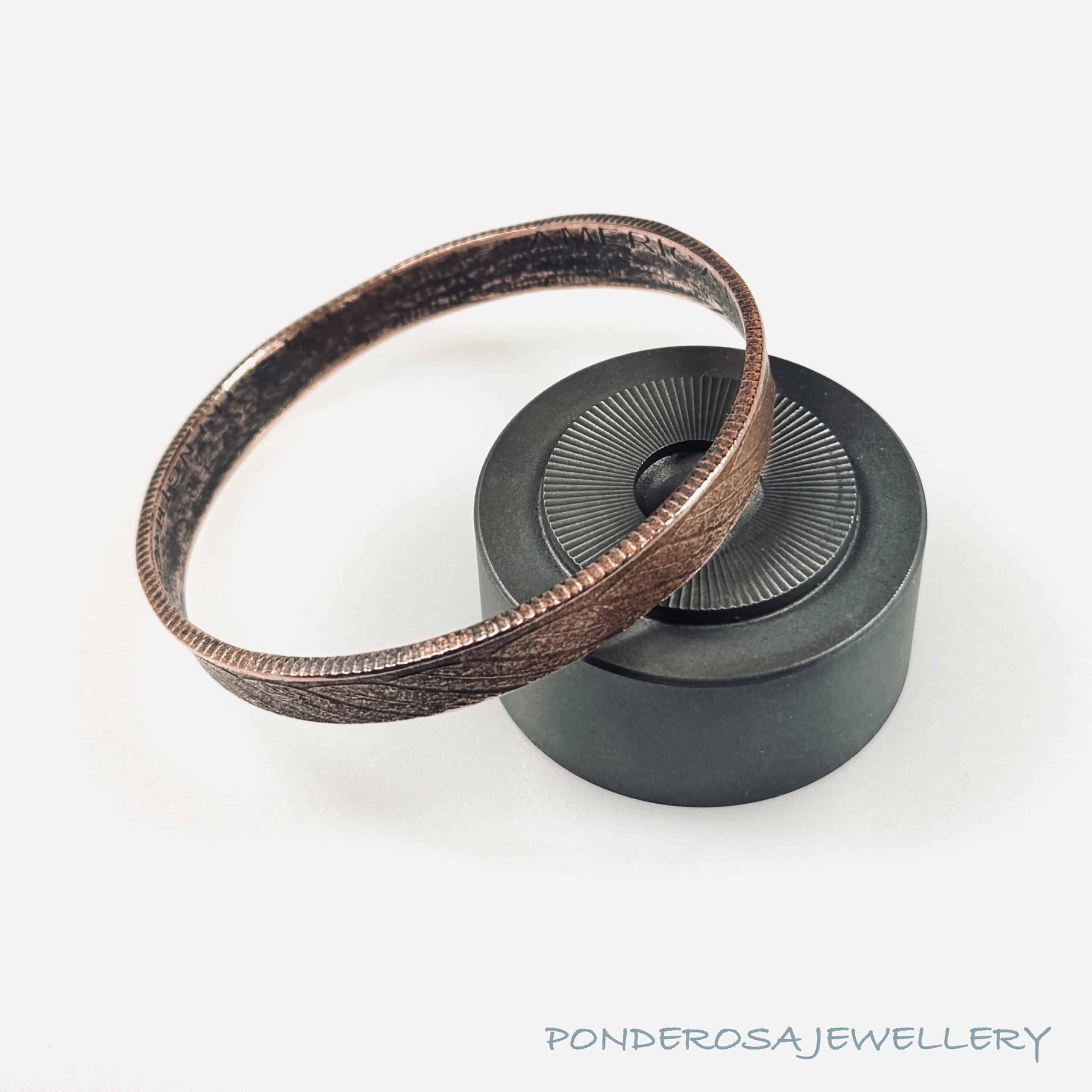 The amazing bracelet was made from a 1 oz .999 Copper Coin. Enjoy wearing this very special piece of jewellery.