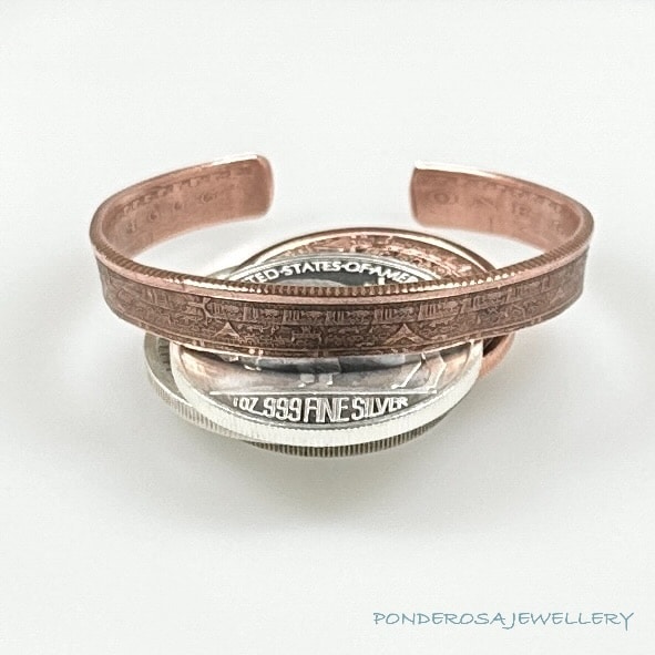 The amazing bracelet was made from a 1 oz .999 Copper Coin. Enjoy wearing this very special piece of jewellery.