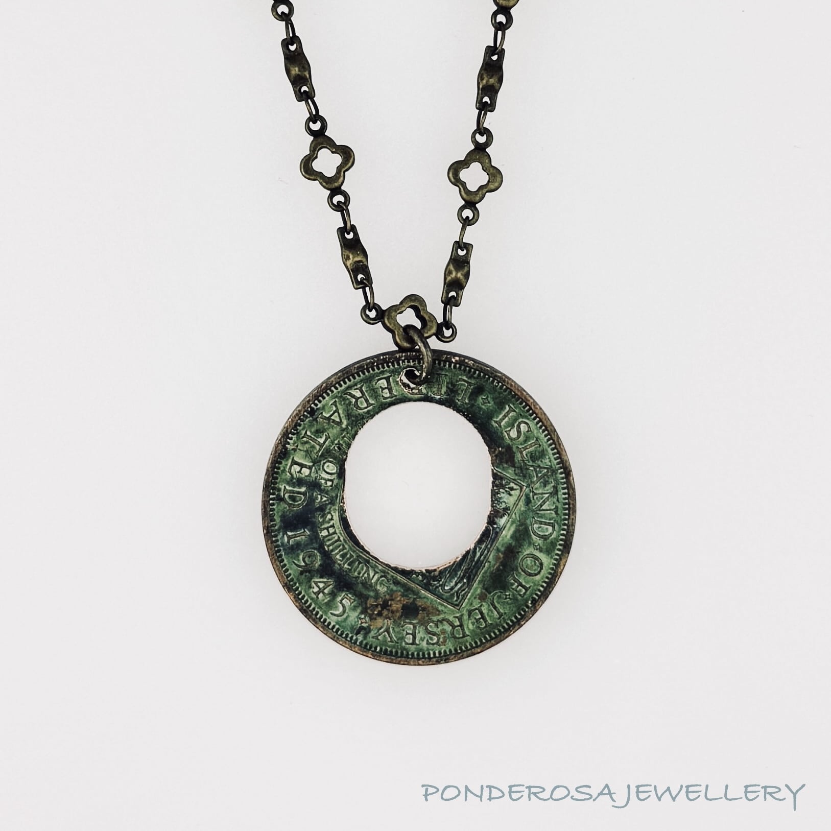 The 1945 British, Island of Jersey, Liberated Coin has been turned into a beautiful necklace with an amazing patina. The coin pendant has a copper content of 80 %. Enjoy wearing this very unusual piece of History.
