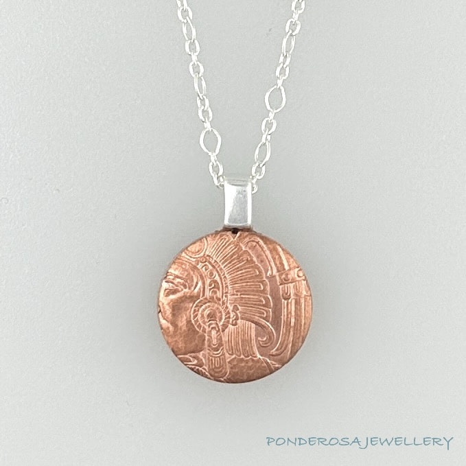 This 5/8 ” round pendant is the punch hole of a copper coin used to make a coin ring. The sterling silver chain is 18 ” long and the copper content of the pendant is 99 %. Enjoy wearing this very unusual and one of a kind piece of History.