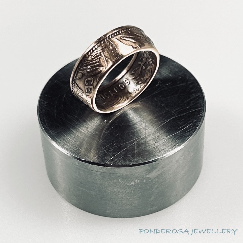 This 1963 Mexican 20 Centavos Coin has been turned into a size 8 1/2 ring. This coin ring has a copper content of 80 %. Enjoy wearing this very unusual piece of History.