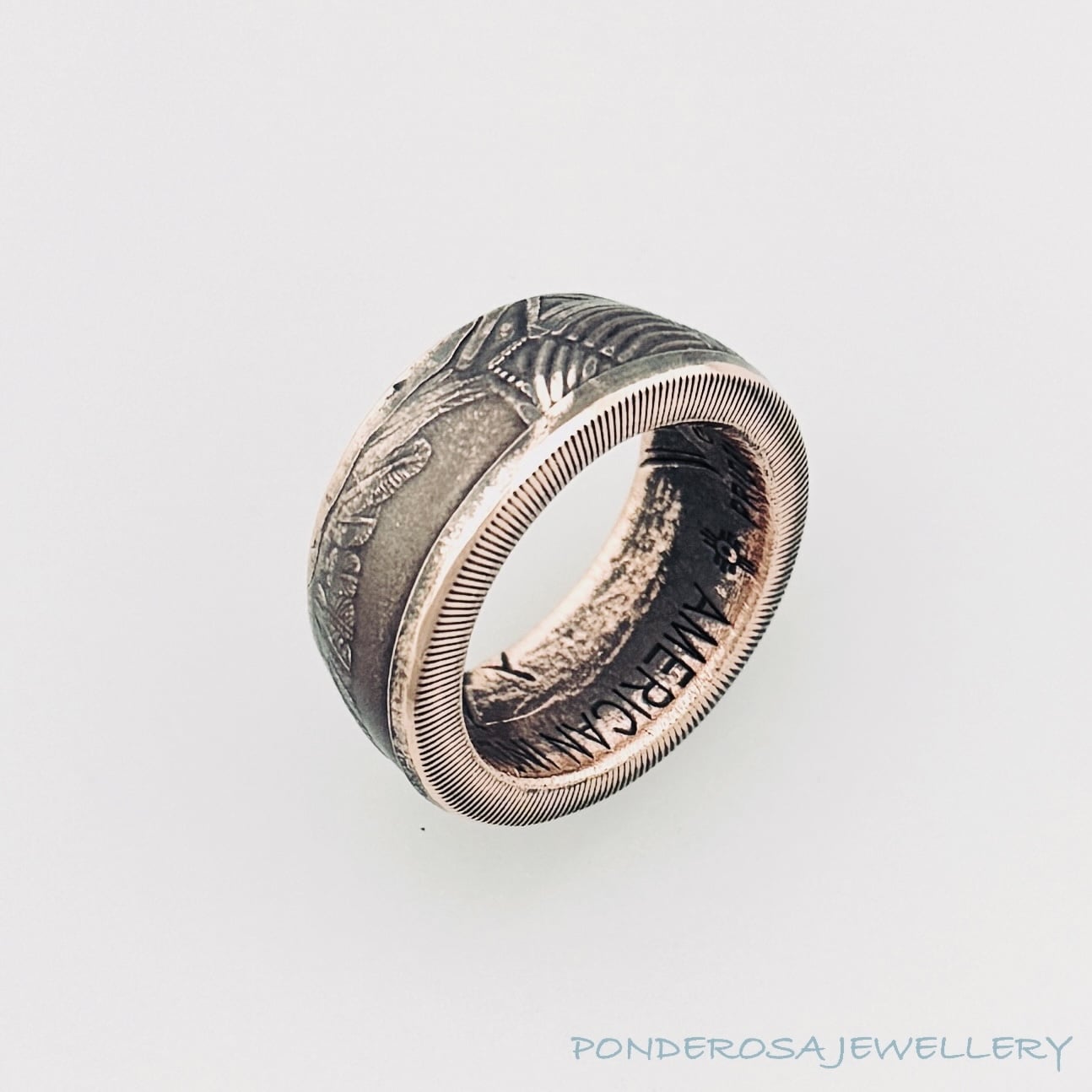 This one ounce, .999 pure copper Challenge Medal, from the Native American series, has been turned into a size 11 ring.  Enjoy wearing this very unusual piece of History.