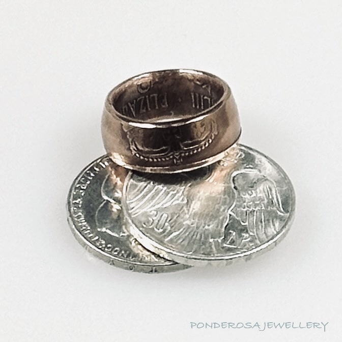 This coin ring is from Queen Elizabeth II Coronation and is a size 8 1/2. This coin ring has a copper content of 99 %.