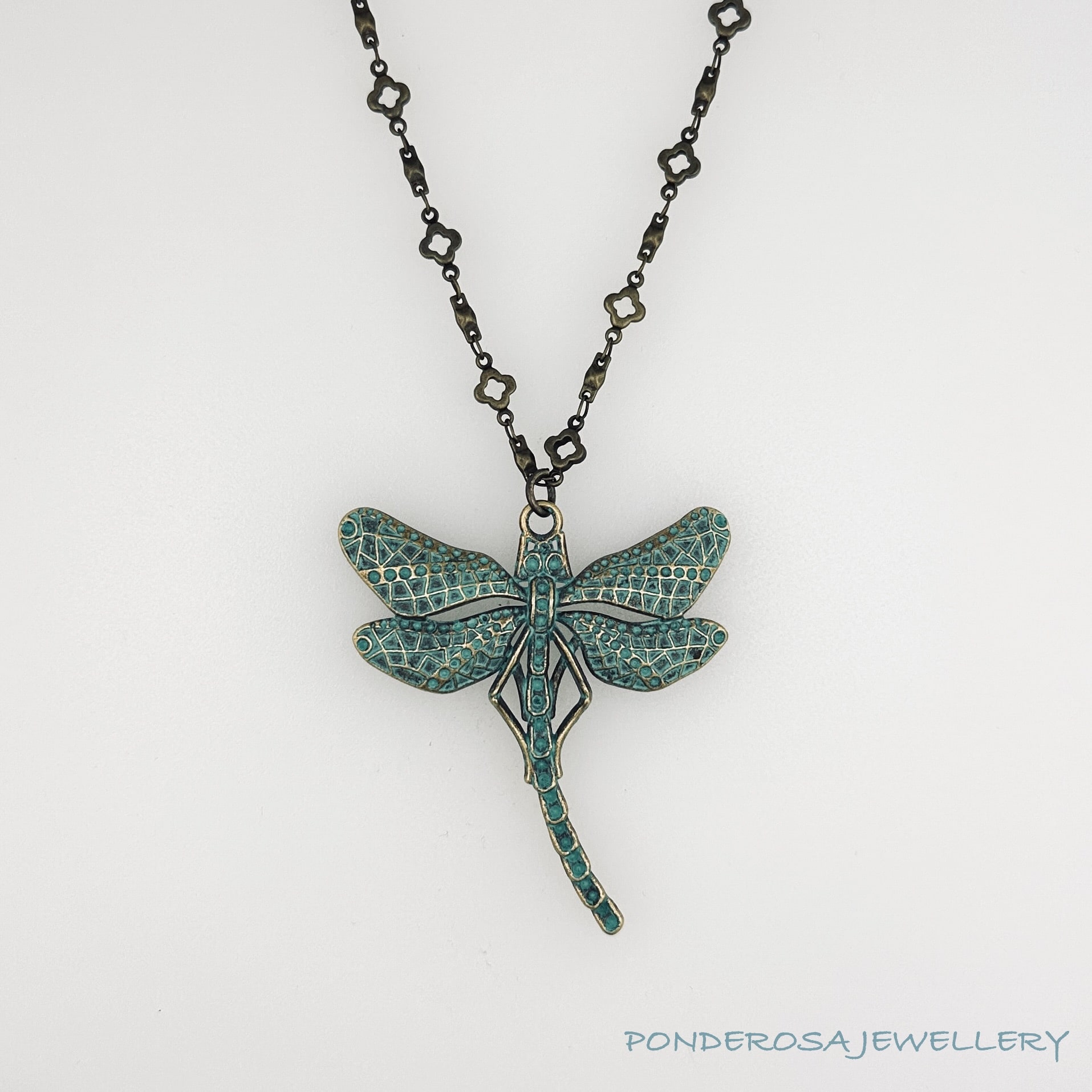 This vibrant oxidized brass dragonfly pendant with turquoise patina has been designed with a brass chain.
