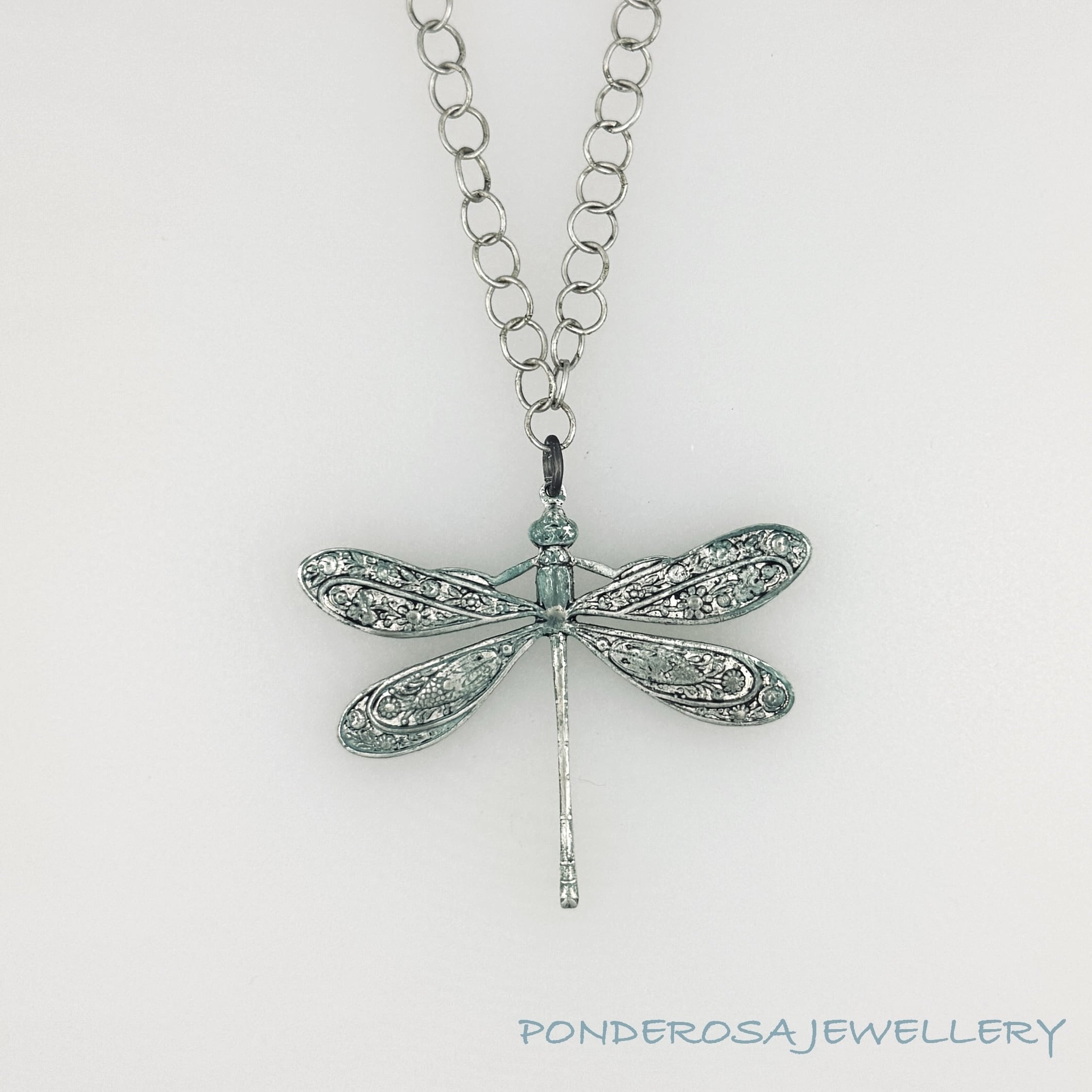 This vibrant blue patina dragonfly pendant has been designed with a plated metal chain.