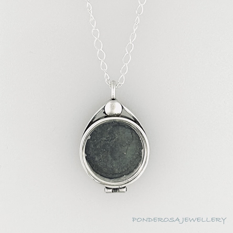 This lovely sterling silver locket features a floating 2000 year old Bronze Roman Artifact.