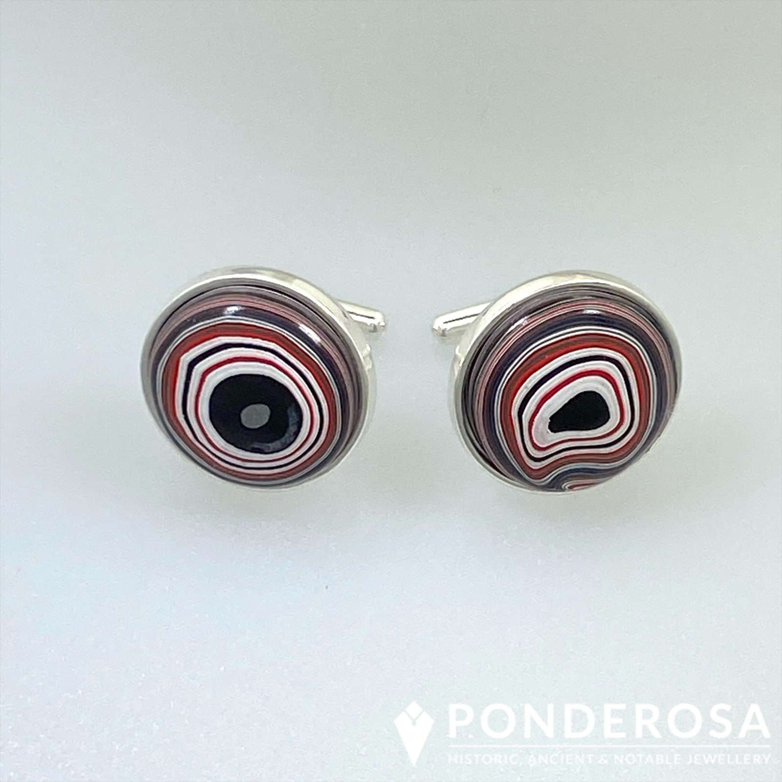 These “One of a Kind” pieces of fordite are set in sterling silver and are 16 mm round.