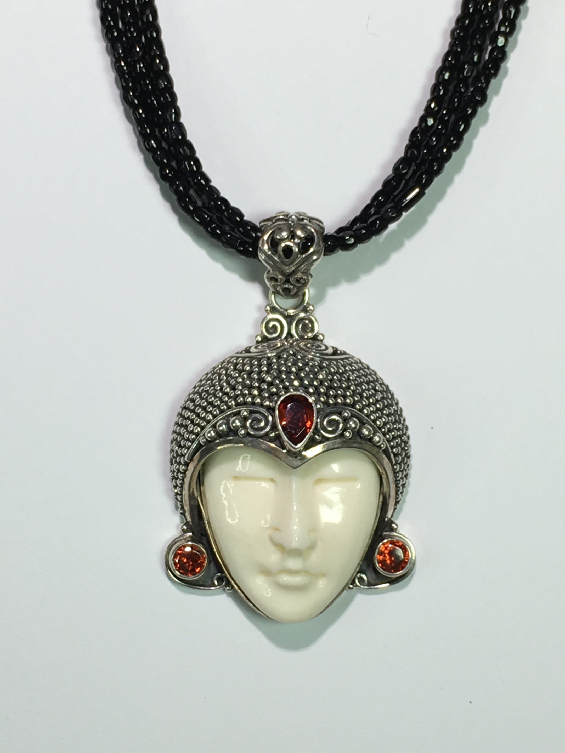 Garnet stone and sterling silver designed with glass seed beads.