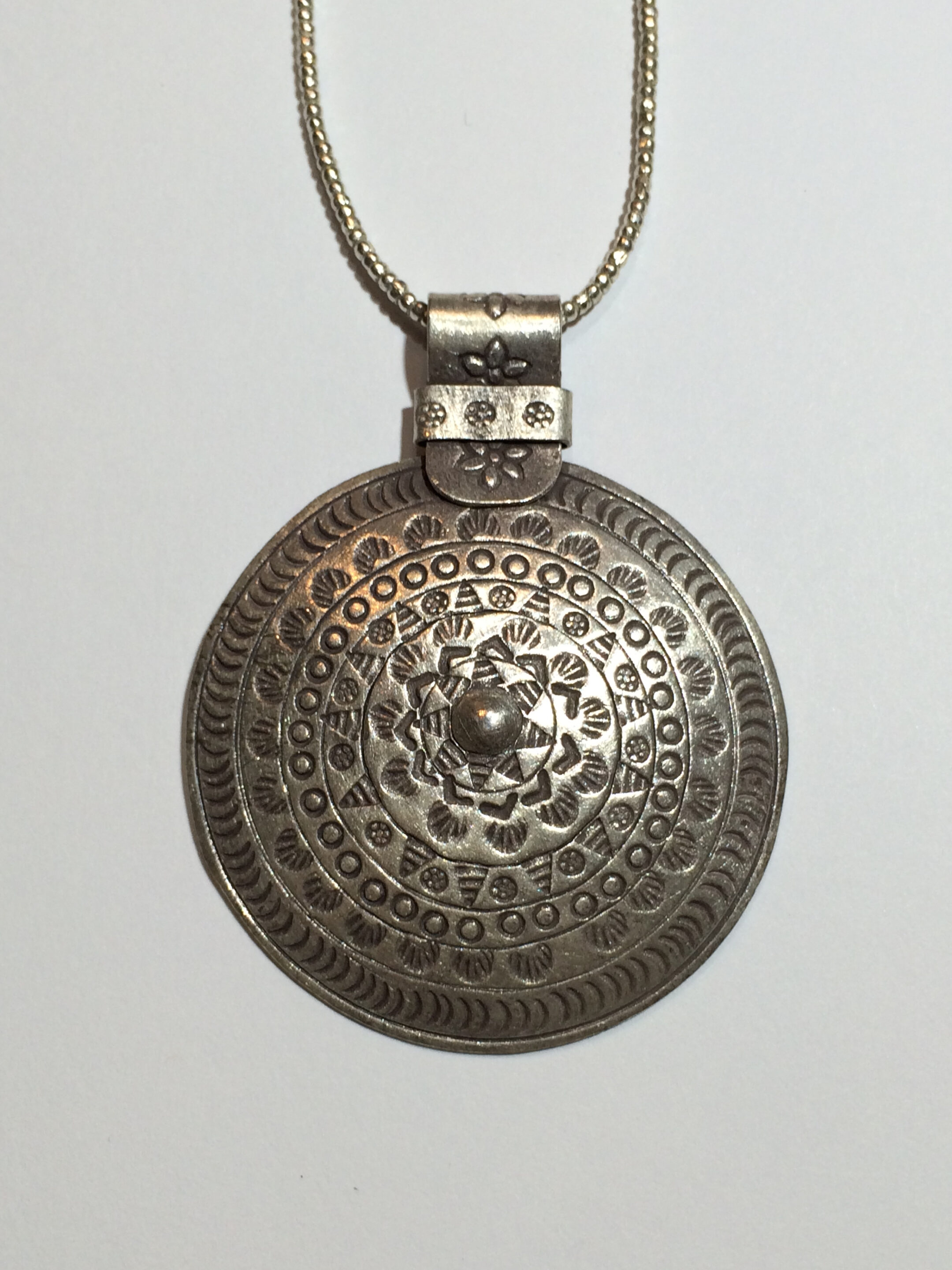 This intricate sterling silver pendant is made from Hill Tribe silver, and is designed with plain silver metal heishe beads.