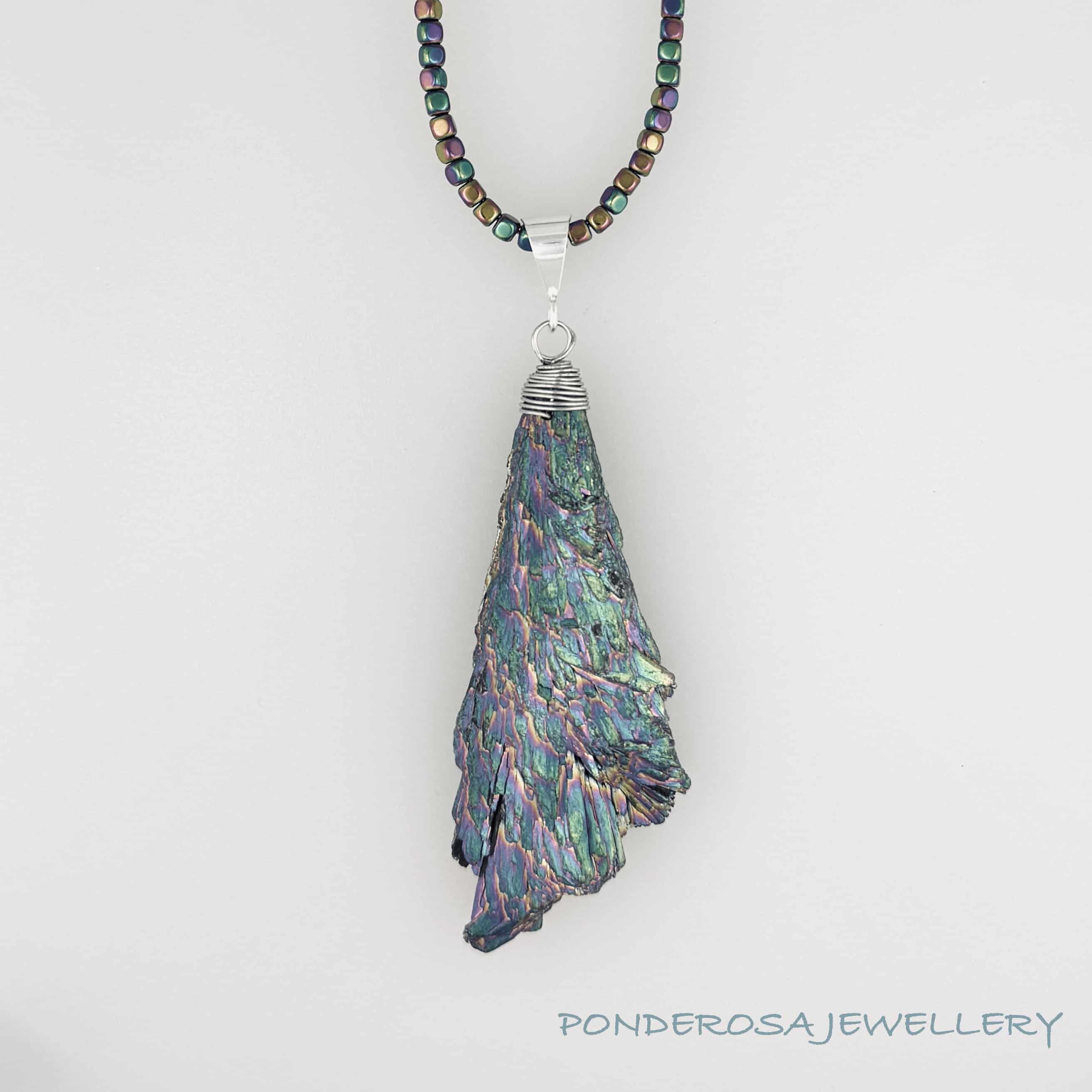 This very unusual Titanium fumed Kyanite stone has been paired perfectly with faceted glass beads Necklace length: 21” Necklace material: faceted glass beads Pendant size: 2 3/4 ” long x 1 ” wide (excluding bale)