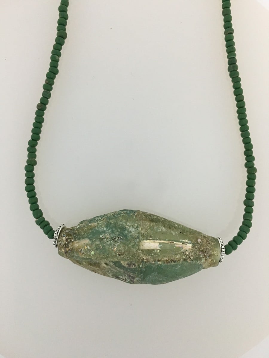 The focus Bead is 2000 years old Roman Glass from the “Old City of Jerusalem”. The chain is designed with 100 year old glass trade beads with a signed pewter clasp.