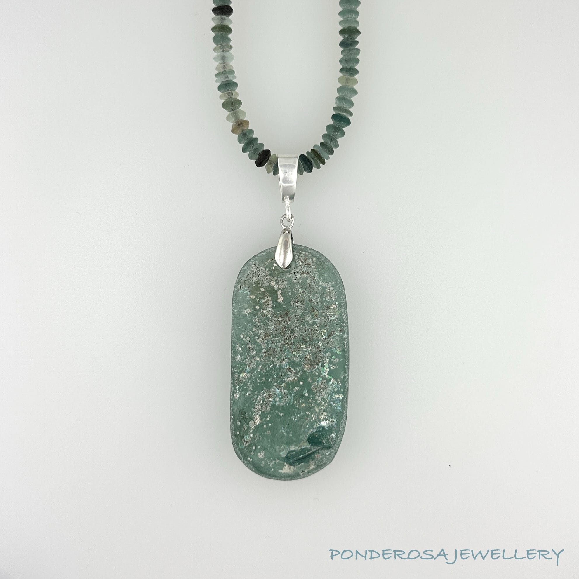 The pendant and the small beads are made from 2000-year-old natural Roman glass. The ancient glass was found in the Middle East near the site of a ancient Roman glass factory.  Chain length: 21 ” Chain material: 2000 year old natural Roman Glass beads Pendant Size:  2 ” tall  1 ” wide (excluding bale)