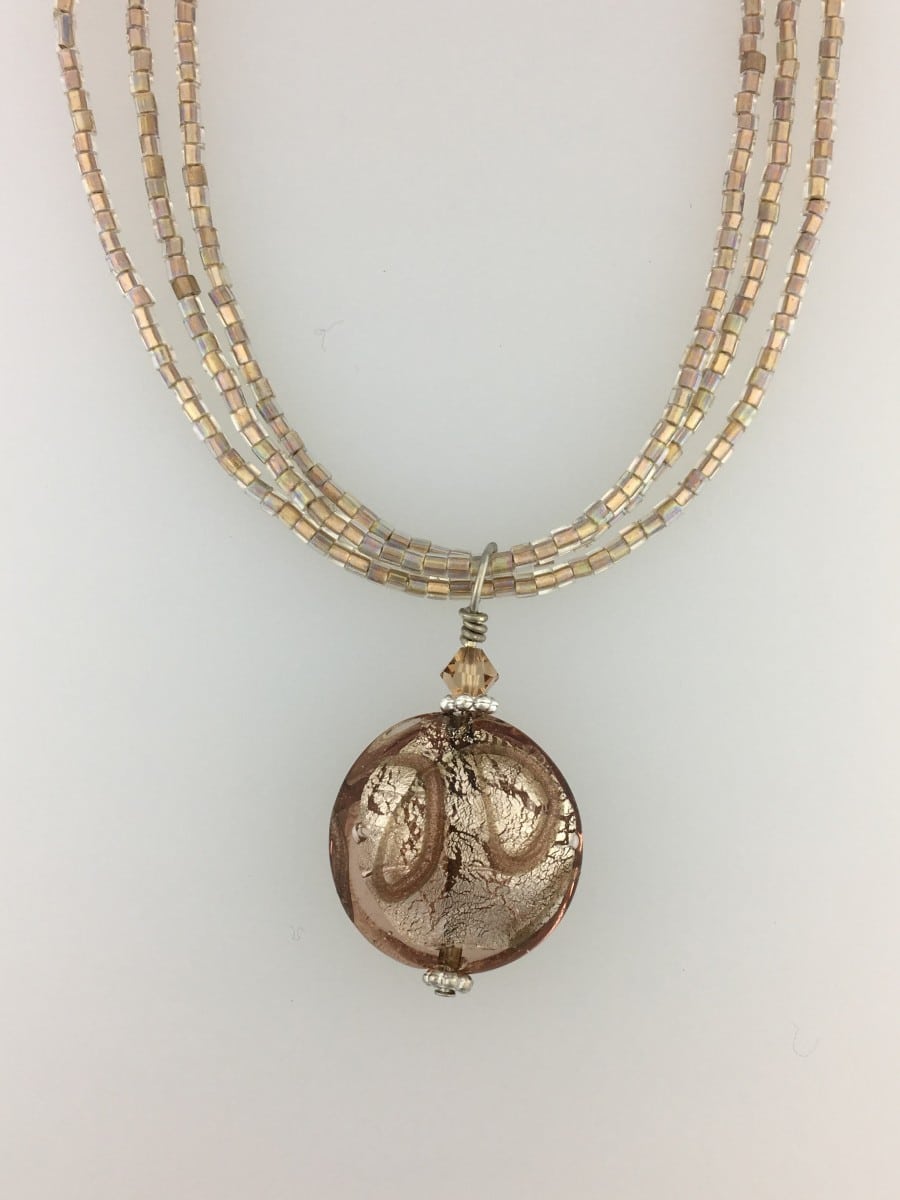 This wonderful Venetian glass bead has been designed with a glass seed beads. Chain length: 19” Chain material: glass seed beads Pendant size: 1 ” round