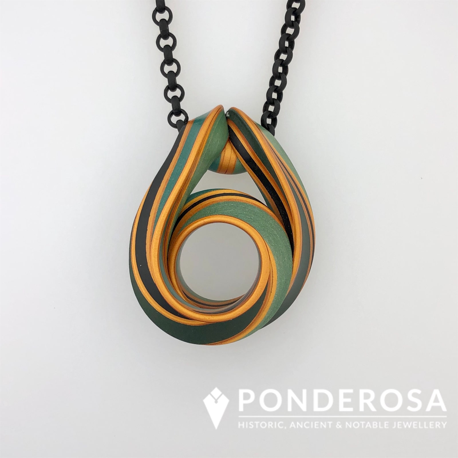 This one of a kind “Polymer Clay” pendant in black, green and gold tones has been designed with a 20 inch matte black chain. This simplistic design showcases the beautiful hand made pendant as the focal point. This lovely piece of jewellery is versatile and reversible making a statement however you choose to wear it.