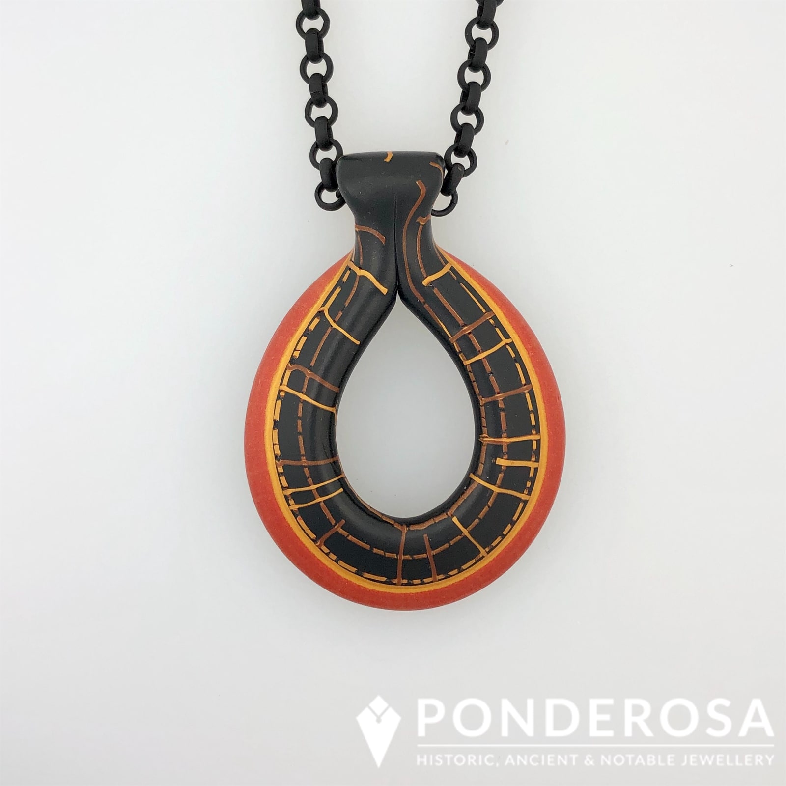 This one of a kind “Polymer Clay” pendant in black and orange tones has been designed with a 20 inch matte black chain. This simplistic design showcases the beautiful hand made pendant as the focal point. This lovely piece of jewellery is versatile making a statement however you choose to wear it.