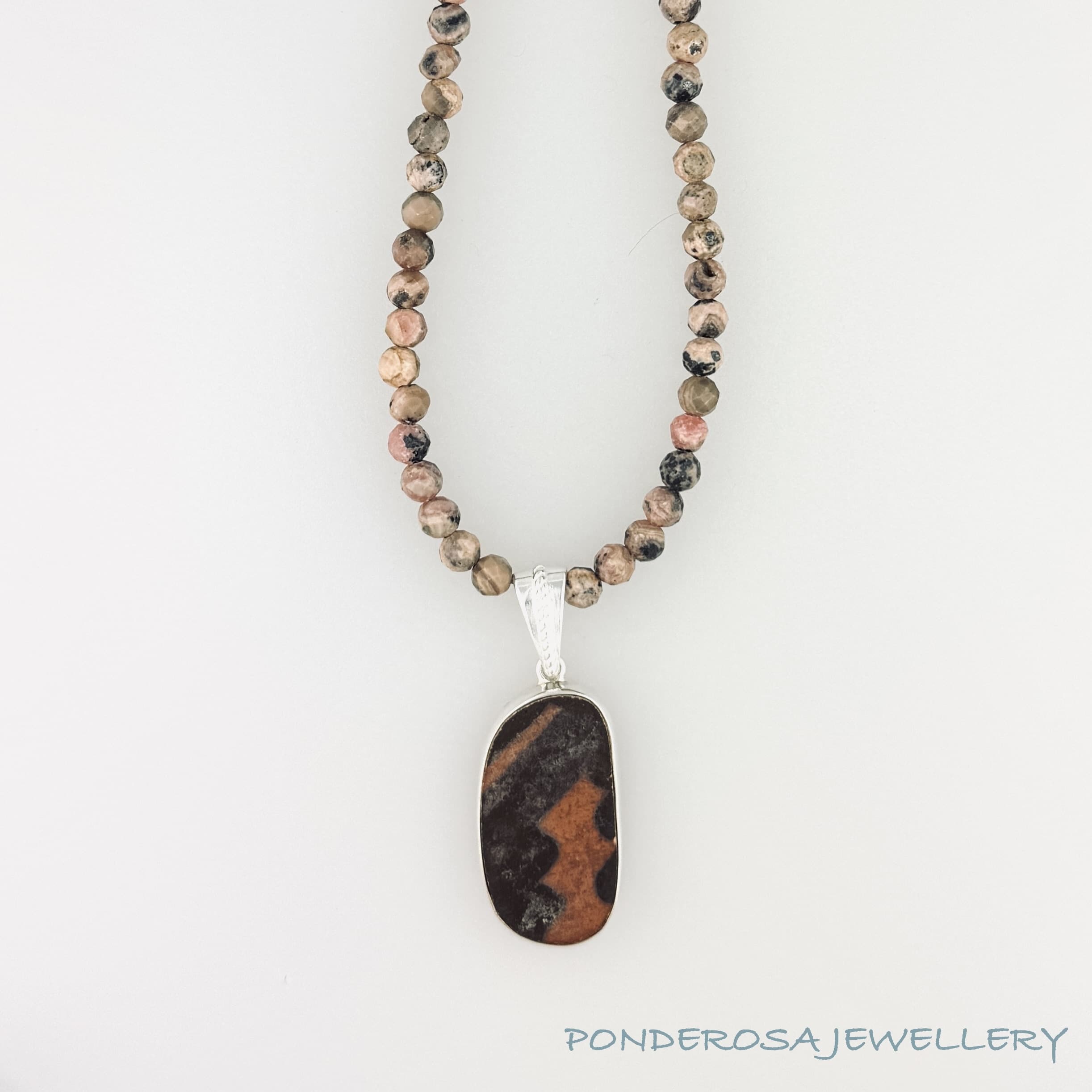 This very rare “Anasazi” Pottery Shard, from the Pueblo culture is 600 – 700 years old. It has been set in sterling silver and designed with perfectly matched faceted stones. Necklace length: 19” Necklace material: faceted stones Pendant size:  1 ” tall x 5/8 ” wide (excluding bale) Pendant setting material: sterling silver
