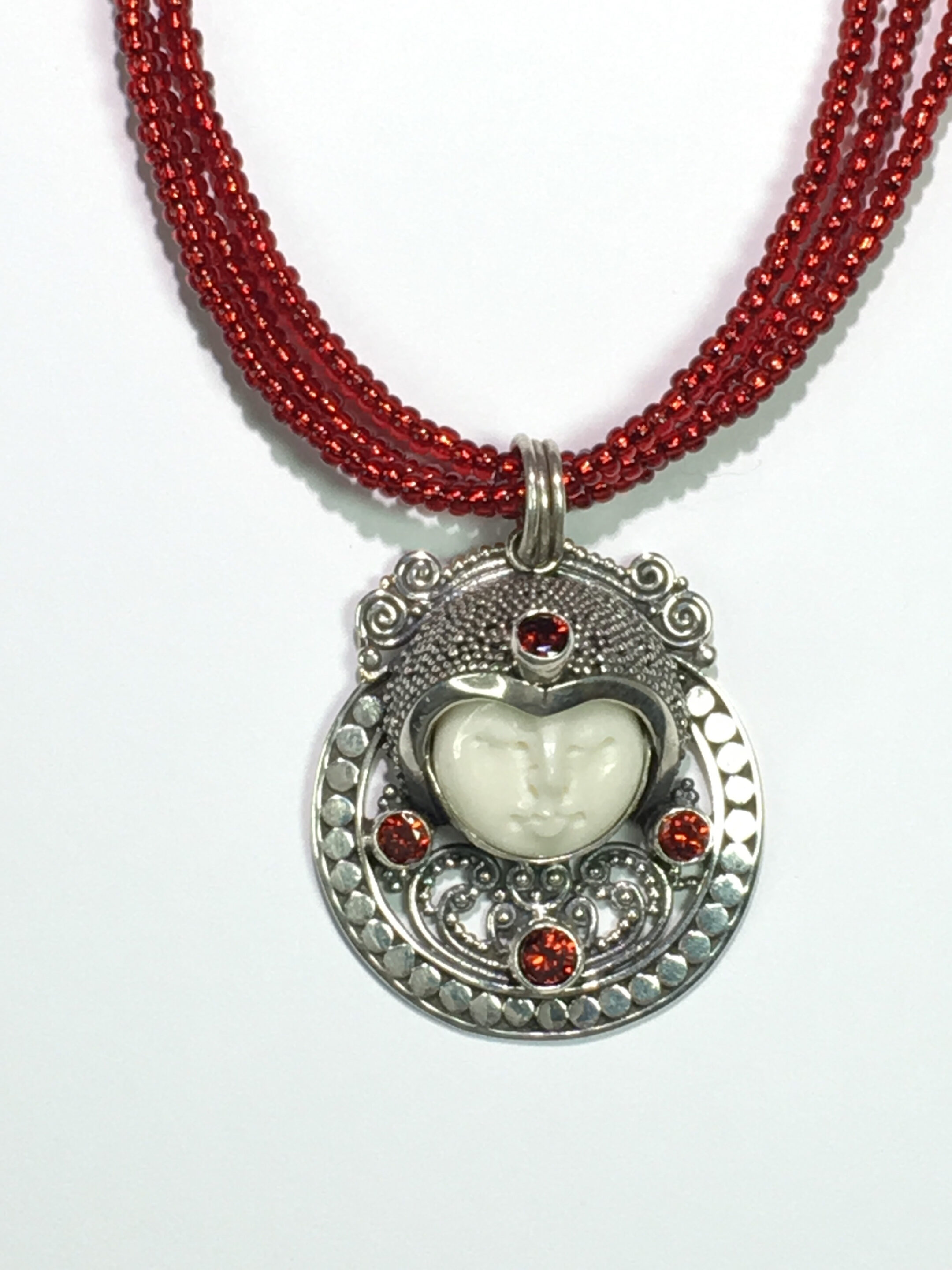 Red quartz stone and sterling silver designed with glass seed beads.
