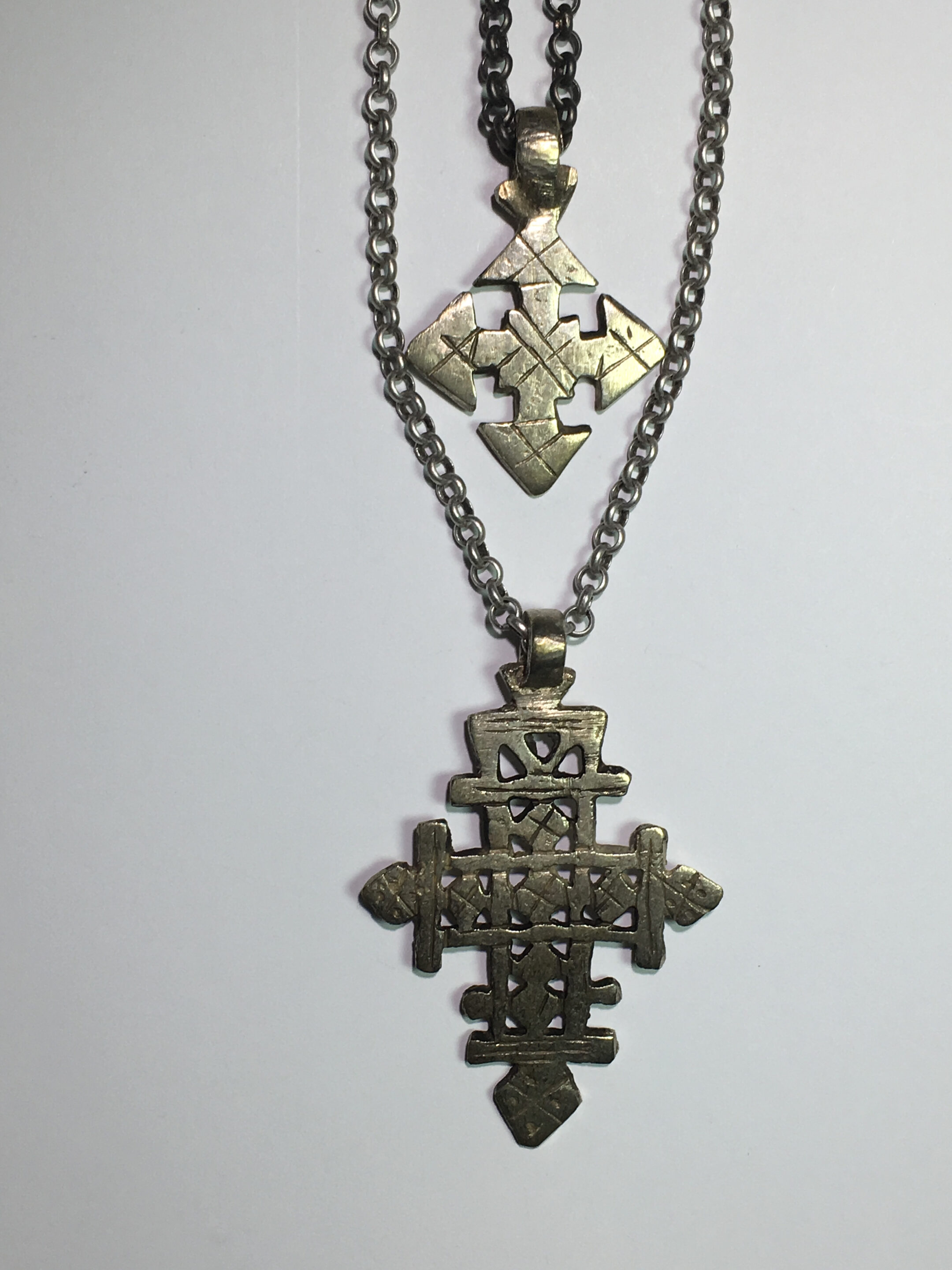 This is one necklaces that has been designed with 2 replica crosses from Ethiopia.  The pewter chain is new.
