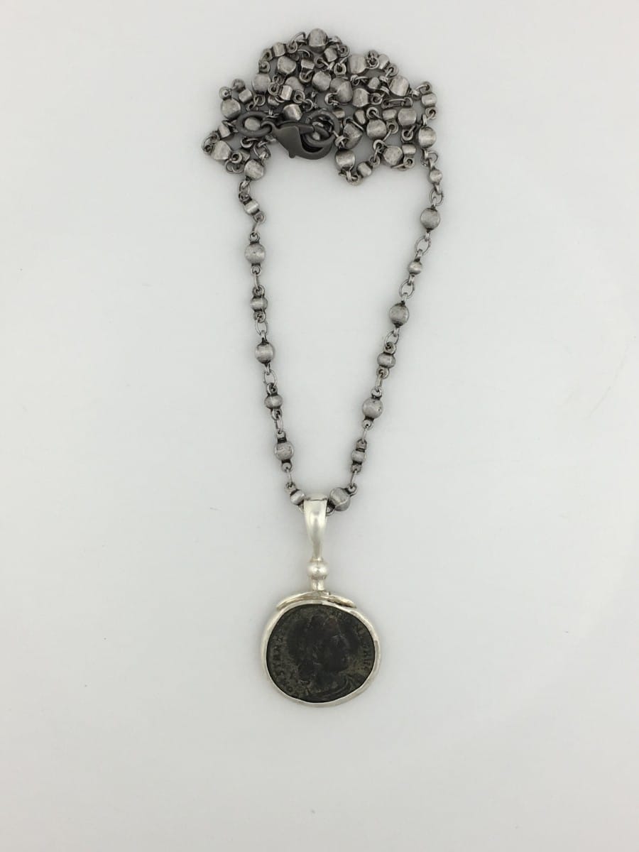 This 2000 year old bronze coin is set in sterling silver, then finished with a 18 inch pewter chain, allowing this artifact to be admired. The necklace comes with a certification card for the coin giving a description of the Empire it is from.