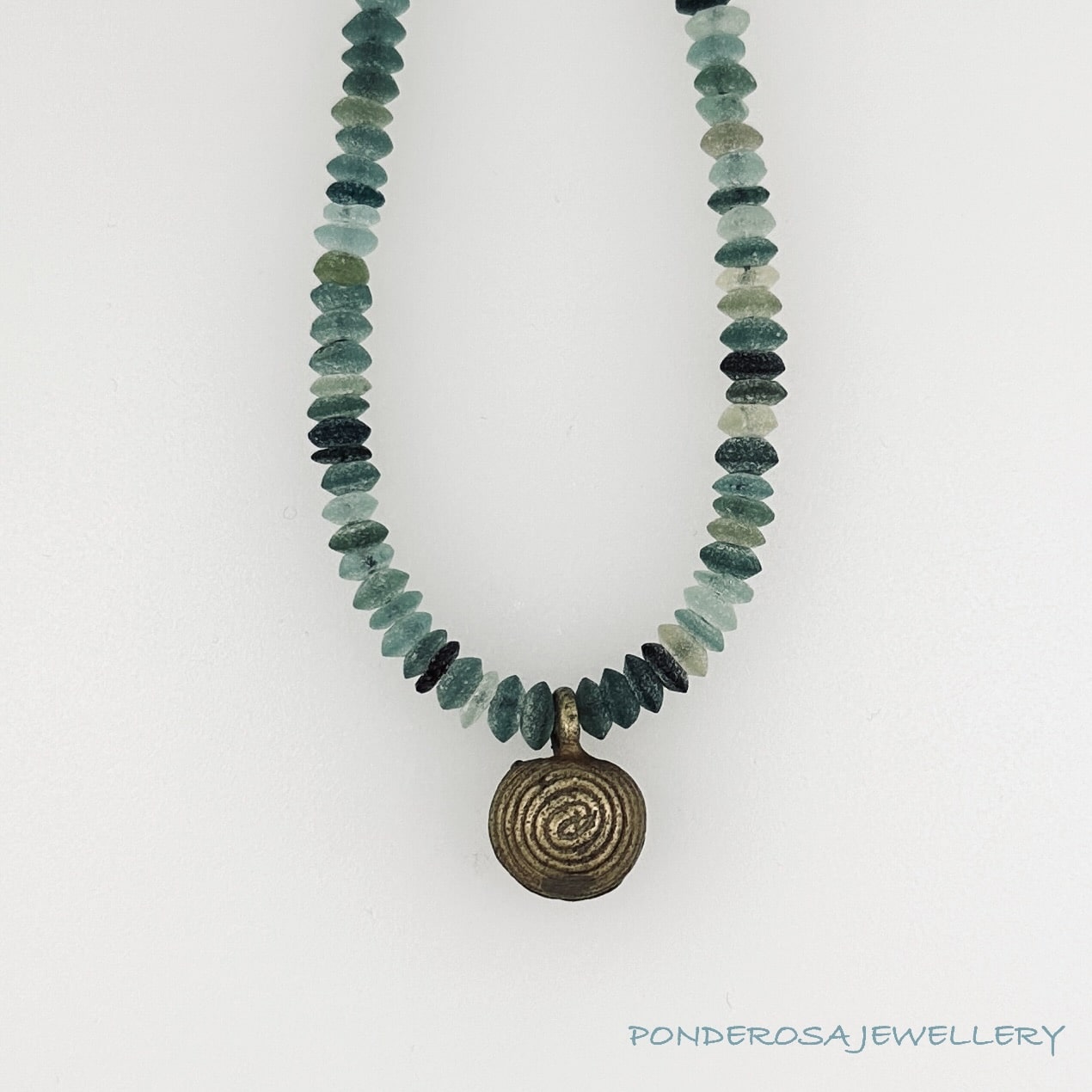 This very unusual necklace has been designed with beads that have been made from 2000 year old Roman Glass and a 100 year old Brass focus bead from Africa. As all of these necklaces are “One of a Kind” there will be slight variations to each one.