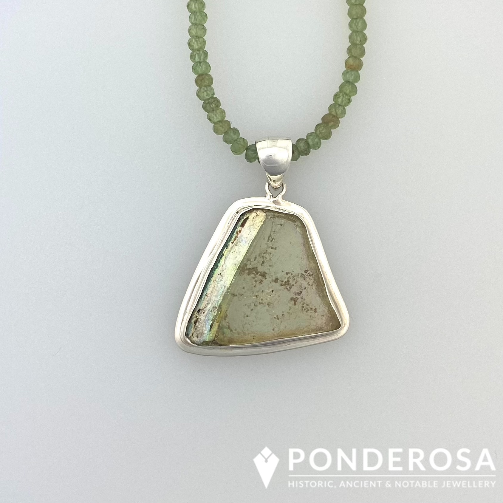 This pendant is a piece of ancient 2000 years old Roman Glass with white iridescent patina. It is set in a beautiful sterling silver design and paired with faceted apatite stones. Vibrant and elegant, this is a one-of-a-kind piece of jewellery to add to any collection.