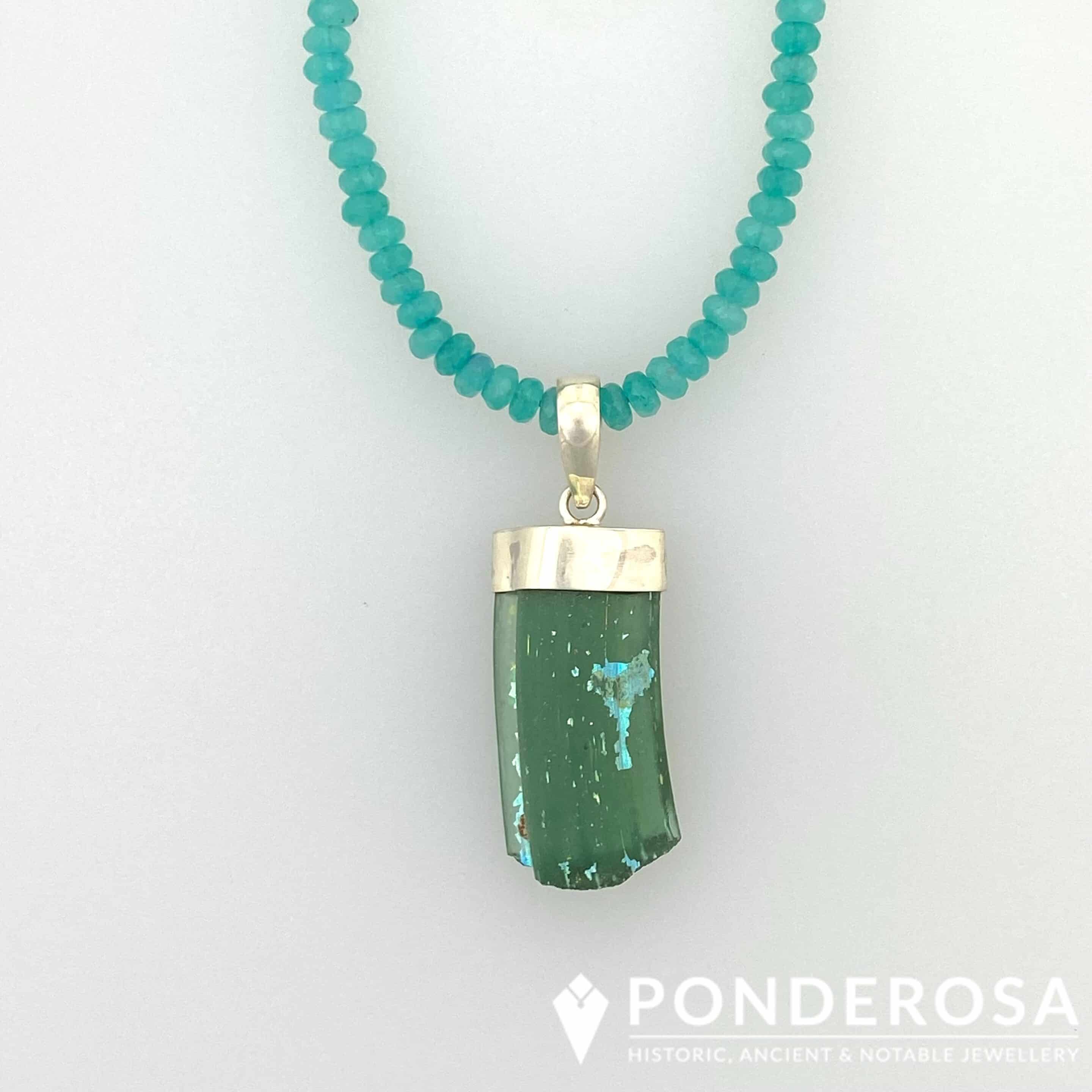 This pendant is a piece of an ancient, 2000 year old Roman Glass handle with gorgeous blue patina. This pendant is set in sterling silver and designed with faceted amazonite stone beads. One-of-a-kind and elegant, this is a special piece of jewellery to add to any collection.