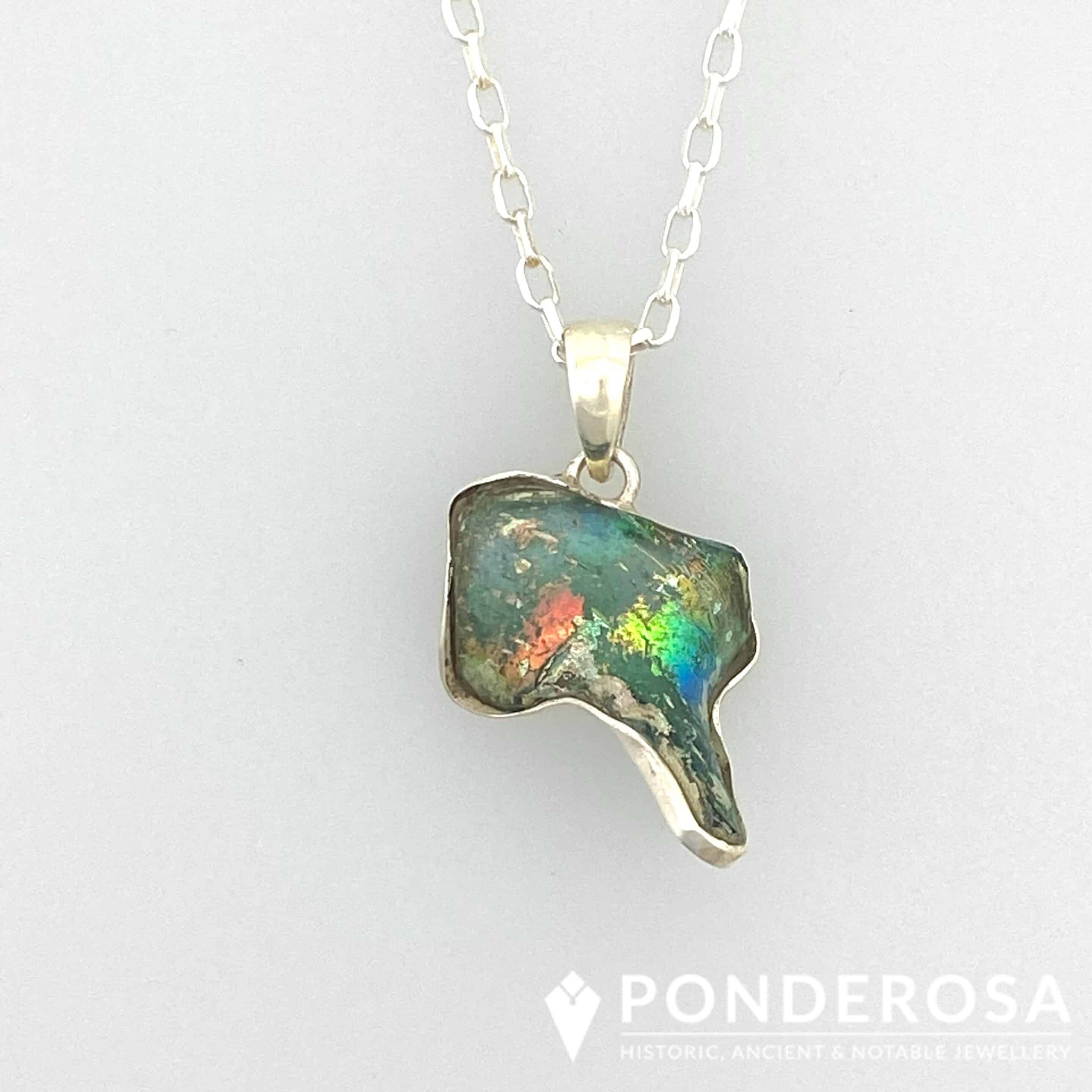 This pendant is a piece of 2000 year old gorgeous Ancient Roman Glass with beautiful patina. This pendant is set in sterling silver and designed with a sterling silver chain. One-of-a-kind and elegant, this is a special piece of jewellery to add to any collection.
